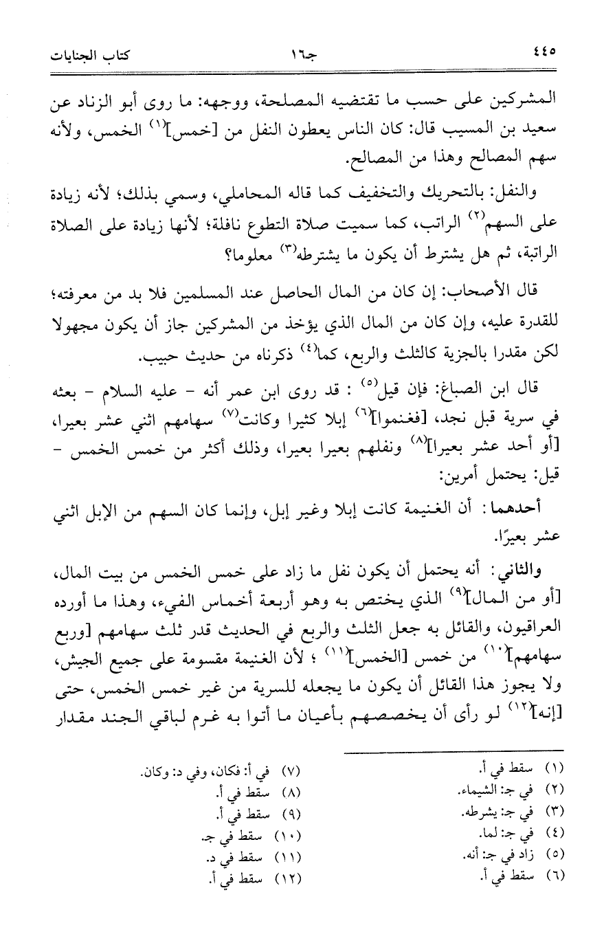 قال ابن الصباغ: فإن قيل: قد روى ابن عمر أنه – عليه السلام – بعثه في سرية قبل نجد، [فغنموا] إبلاً كثيراً وكانت سهامهم اثني عشر بعيراً، [أو أحد عشر بعيراً] ونفلهم بعيراً بعيراً، وذلك أكثر من خمس الخمس – قيل: يحتمل أمرين: