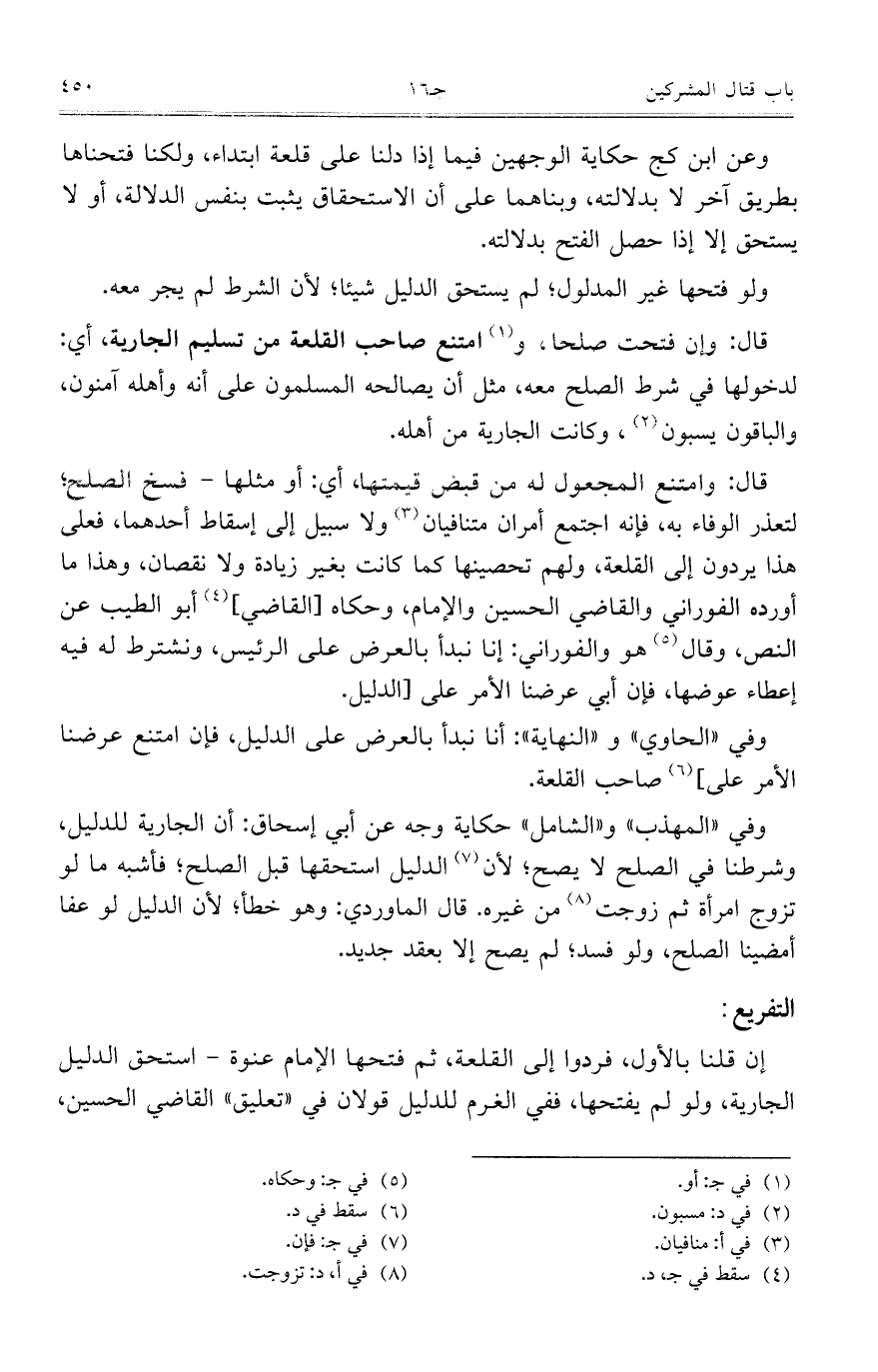 وفي "المهذب" و"الشامل" حكاية وجه عن أبي إسحاق: أن الجارية للدليل، وشرطنا في الصلح لا يصح؛ لأن الدليل استحقها قبل الصلح؛ فأشبه ما لو تزوج امرأة ثم زوجت من غيره. قال الماوردي: وهو خطأ؛ لأن الدليل لو عفا أمضينا الصلح، ولو فسد؛ لم يصح إلا بعقد جديد.