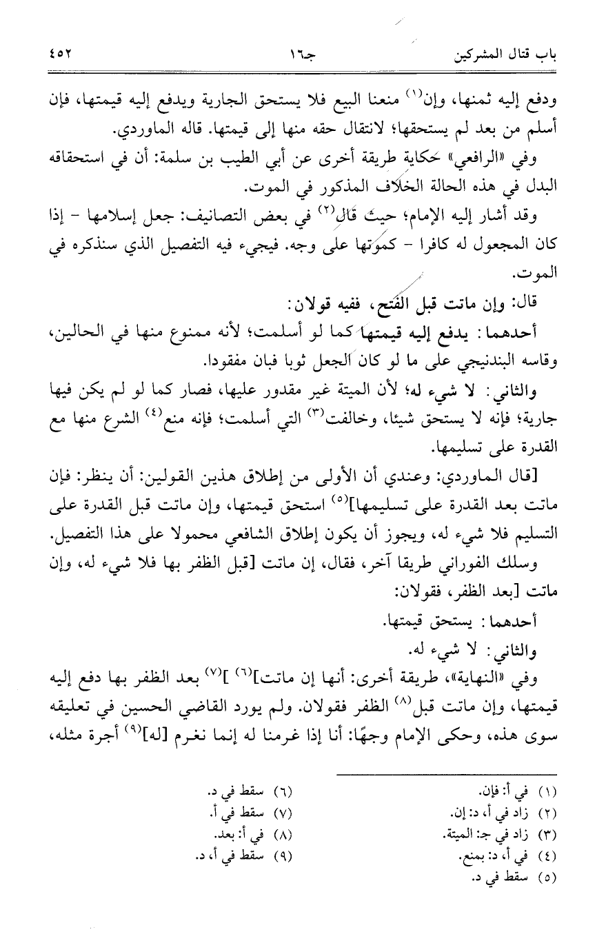 والثاني: لا شيء له؛ لأن الميتة غير مقدرو عليها، فصار كما لو لم يكن فيها جارية؛ فإنه لا يستحق شيئاً، وخالفت التي أسلمت؛ فإنه منع الشرع منها مع القدرة على تسليمها.