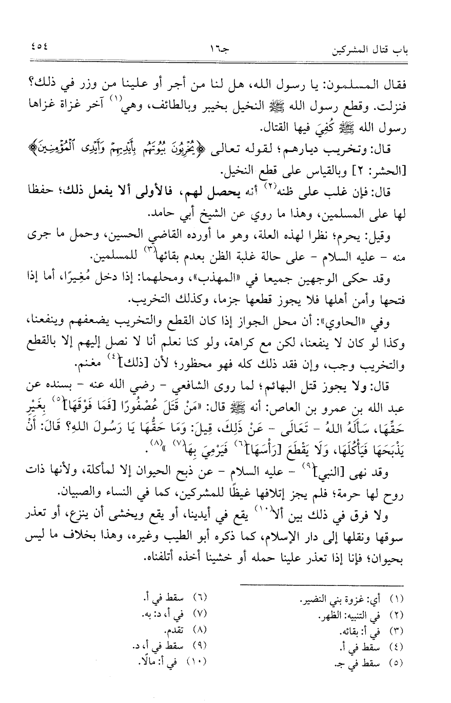 وقد نهى [النبي] – عليه السلام – عن ذبح الحيوان إلا لمأكلة، ولأنها ذات روح لها حرمة؛ فلم يجز إتلافها غيظاً للمشركين، كما في النساء والصبيان.