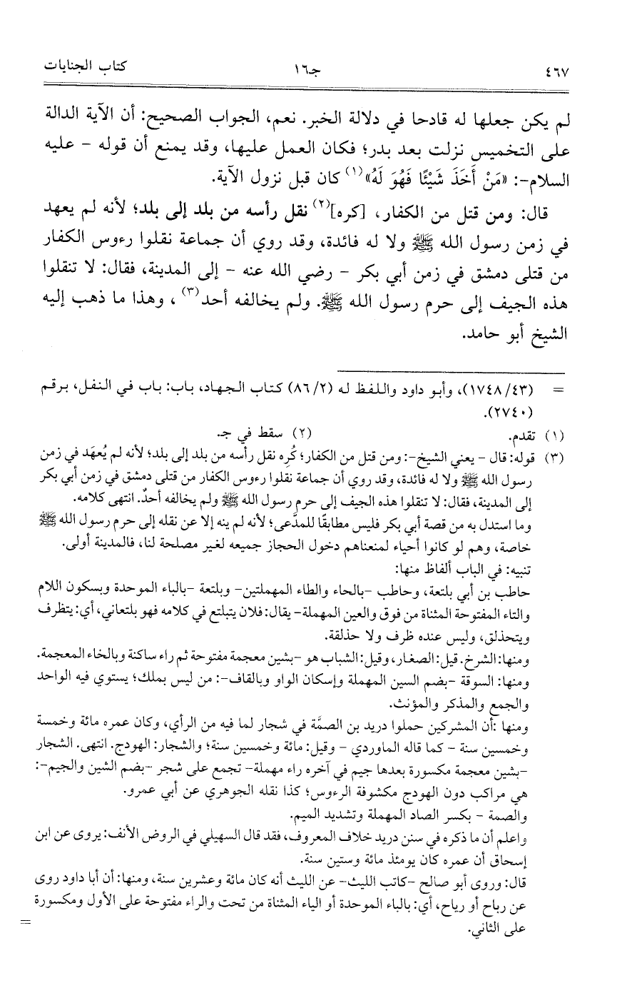 قال: ومن قتل من الكفار، [كره] نقل رأسه من بلد إلى بلد؛ لأنه لم يعهد في زمن رسول الله صلى الله عليه وسلم ولا له فائدة، وقد روي أن جماعة نقلوا رءوس الكفار من قتلى دمشق في زمن أبي بكر – رضي الله عنه – إلى المدينة، فقال: لا تنقلوا هذه الجيف إلى حرم رسول الله صلى الله عليه وسلم. ولم يخالفه أحد، وهذا ما ذهب إليه الشيخ أبو حامد.