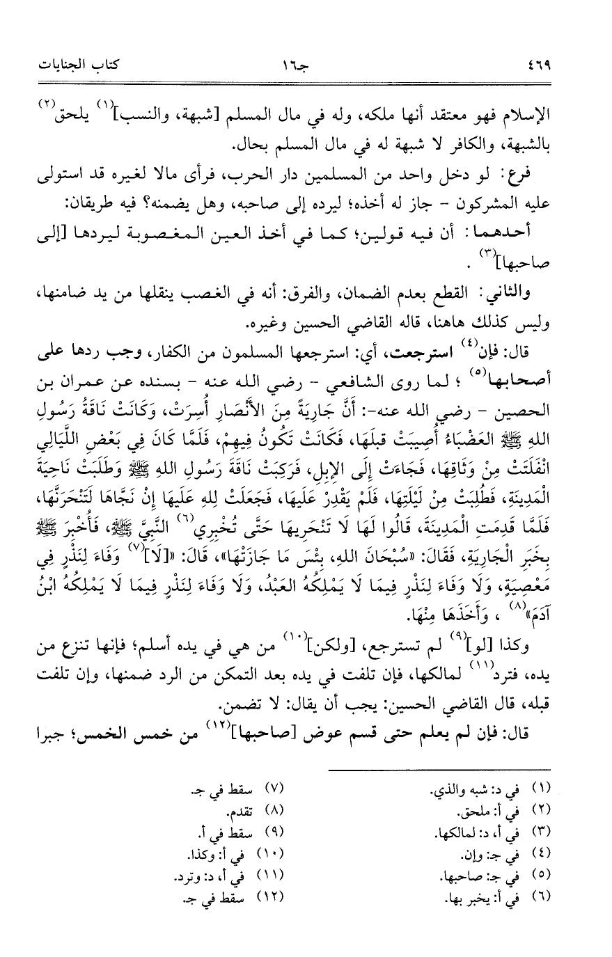 قال: فإن استرجعت، أي: استرجعها المسلمون من الكفار، وجب ردها على أصحابها؛ لما روى الشافعي – رضي الله عنه – بسنده عن عمران بن الحصين – رضي الله عنه -: أَنَّ جَارِيَةً مِنَ الأَنْصَارِ أُسِرَتْ، وَكَانَتْ نَاقَةُ رَسُولِ اللهِ صلى الله عليه وسلم العَضْبَاءُ أُصِيبَتْ قبلَهَا، فَكَانَتْ تَكُونُ فِيهِمْ، فَلَمَّا كَانَ فِي بَعْضِ اللَّيَالِي انْفَلَتَتْ مِنْ وَثَاقِهَا، فَجَاءَتْ إِلَى الإِبِلِ، فَرَكِبَتْ نَاقَةَ رَسُولِ اللهِ صلى الله عليه وسلم وَطَلَبَتْ نَاحِيَةَ الْمَدِينَةِ، فَطُلِبَتْ مِنْ لَيْلَتِهَا، فَلَمْ يَقْدِرْ عَلَيهَا، فَجَعَلَتْ للهِ عَلَيهَا إِنْ نَجَّاهَا لَتَنْحَرَنَّهَا، فَلَمَّا قَدِمَتِ الْمَدِينَةَ، قَالُوا لَهَا لاَ تَنْحَرِيهَا حَتَّى تُخْبِرِي النَّبِيَّ صلى الله عليه وسلم، فَأُخْبِرَ صلى الله عليه وسلم بِخَبَرِ الْجَارِيَةِ، فَقَالَ: "سُبْحَانَ اللهِ، بِئْسَ مَا جَازَتْهَا"، قَالَ: [لاَ] وَفَاءَ لِنَذْرٍ فِي مَعْصِيَةٍ، وَلاَ وَفَاءَ لِنَذْرٍ فِيمَا لاَ يَمْلِكُهُ العَبْدُ، وَلاَ وَفَاءَ لِنَذْرٍ فِيمَا لاَ يَمْلِكُهُ ابْنُ آدَمَ"، وَأَخَذَهَا مِنْهَا.