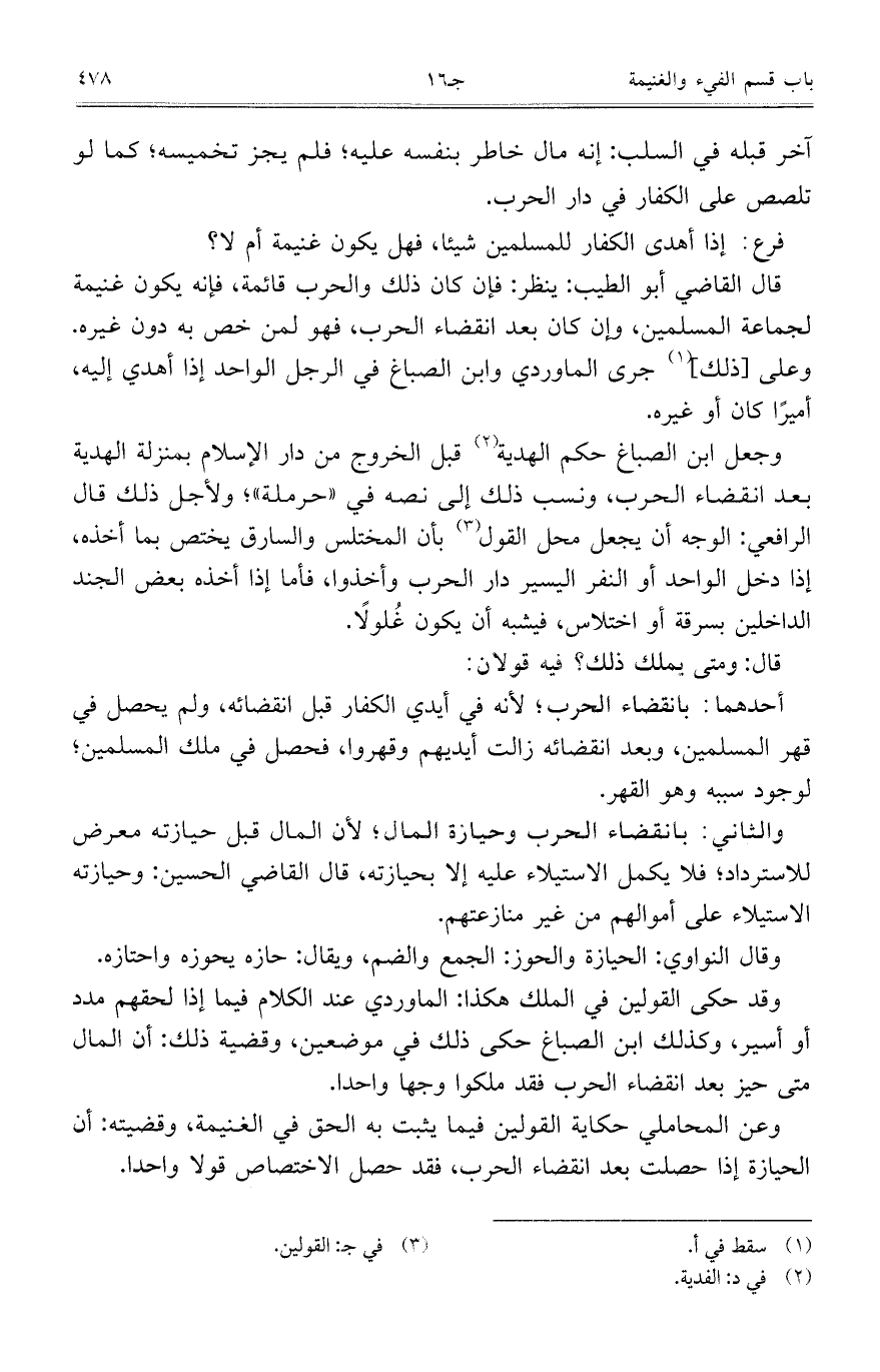 وقد حكى القولين في الملك هكذا: الماوردي عند الكلام فيما إذا لحقهم مدد أو أسير، وكذلك ابن الصباغ حكى ذلك في موضعين، وقضية ذلك: أن المال متى حيز بعد انقضاء الحرب فقد ملكوا وجهاً واحداً.