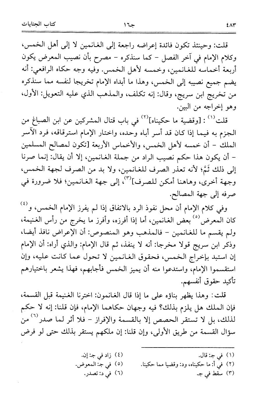 قلت: [وقضية ما حكيناه] في باب قتال المشركين عن ابن الصباغ من الجزم به فيما إذا كان قد أسر أباه وحده، واختار الإمام استرقاقه، فرد الآسر الملك – أن خمسه لأهل الخمس، والأخماس الأربعة [تكون لمصالح المسلمين – أن يكون هذا حكم نصيب الراد من جملة الغانمين، إلا أن يقال: إنما صرنا إلى ذلك ثَمَّ؛ لأنه تعذر الصرف للغانمين، ولابد من الصرف لجهة الخمس، وجهة أخرى، وهاهنا أمكن للصرف]، إلى جهة الغانمين؛ فلا ضرورة في صرفه إلى جهة المصالح.