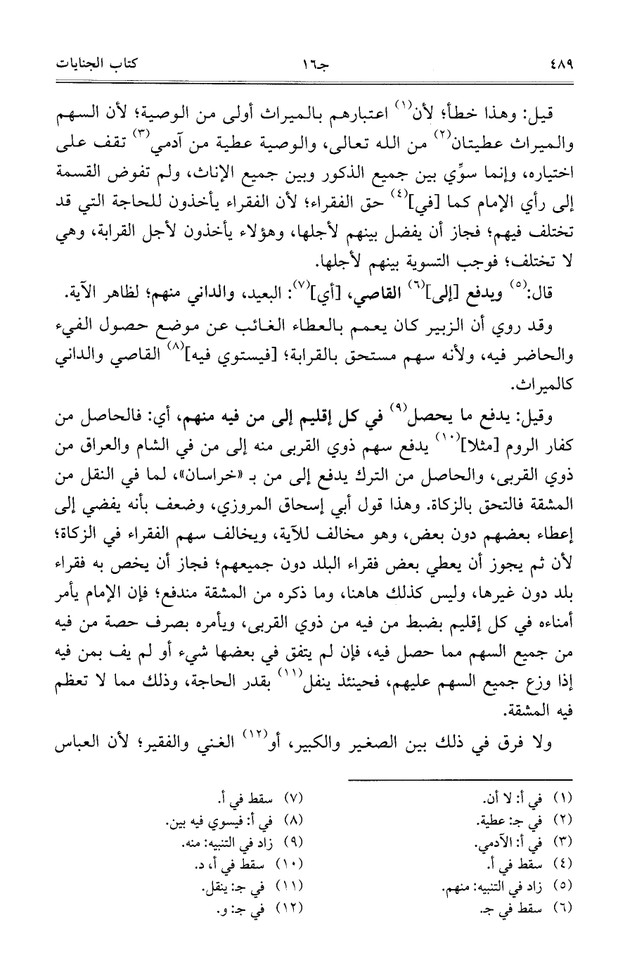 وقيل: يدفع ما يحصل في كل إقليم إلى من فيه منهم، أي: فالحاصل من كفار الروم [مثلا] يدفع سهم ذوي القربى منه إلى من في الشام والعراق من ذوي القربى، والحاصل من الترك يدفع إلى من بـ "خراسان"، لما في النقل من المشقة فالتحق بالزكاة. وهذا قول أبي إسحاق المروزي، وضعف بأنه يفضي إلى إعطاء بعضهم دون بعض، وهو مخالف للآية، ويخالف سهم الفقراء في الزكاة؛ لأن ثم يجوز أن يعطي بعض فقراء البلد دون جميعهم؛ فجاز أن يخص به فقراء بلد دون غيرها وليس كذلك هاهنا، وما ذكره من المشقة مندفع؛ فإن الإمام يأمر أمناءه في كل إقليم بضبط من فيه من ذوي القربى، ويأمره بصرف حصة من فيه من جميع أسهم مما حصل فيه، فإن لم يتفق في بعضها شيء أو لم يف بمن فيه إذا وزع جميع السهم عليهم، فحينئذ ينفل بقدر الحاجة، وذلك مما لا تعظم فيه المشقة.