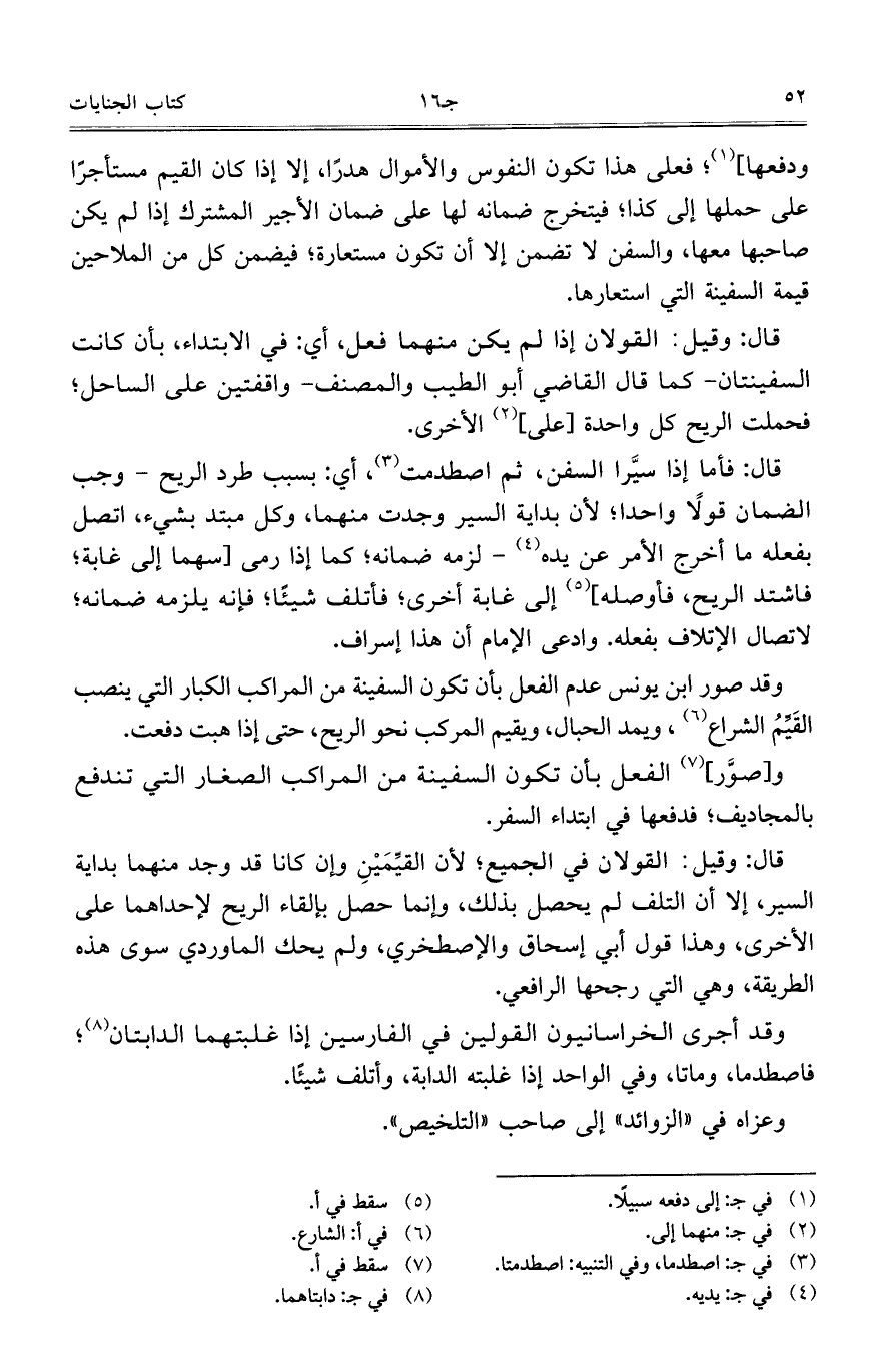 ودفعها]؛ فعلى هذا تكون النفوس الأموال هدراً، إلا إذا كان القيم مستأجراً على حملها إلى كذا؛ فيتخرج ضمانه لها على ضمان الأجير المشترك إذا لم يكن صاحبها معها، والسفن لا تضمن إلا أن تكون مستعارة؛ فيضمن كل من الملاحين قيمة السفينة التي استعارها.