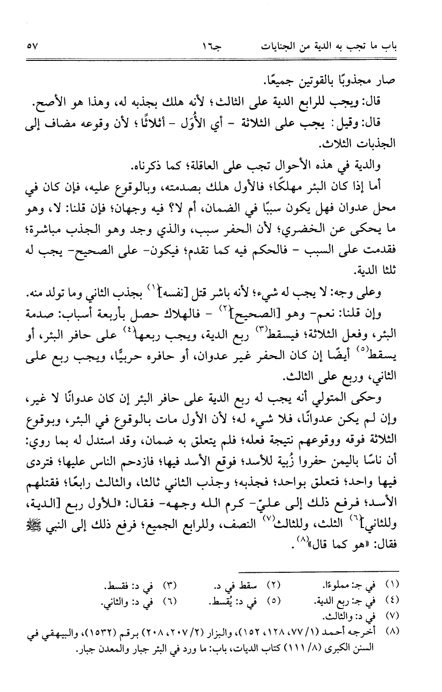 وإن قلنا: نعم – وهو [الصحيح] – فالهلاك حصل بأربعة أسباب: صدمة البئر، وفعل الثلاثة؛ فيسقط ربع الدية، ويجب ربعها على حافر البئر، أو يسقط أيضاً إن كان الحفر غير عدوان، أو حافره حربيًّا، ويجب ربع على الثاني، وربع على الثالث.
