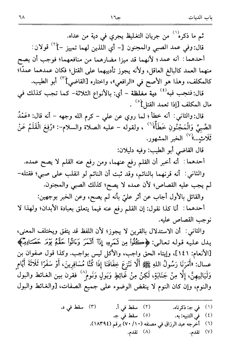 قال: والثاني: أنه خطأ؛ لما روي عن علي – كرم الله وجهه – أنه قال: "عَمْدُ الصَّبِيِّ وَالْمَجْنُونِ خَطَأُ"، ولقوله – عليه الصلاة والسلام-: "رُفِعَ الْقَلَمُ عَنْ ثَلاَثٍ ... " الخبر المشهور.