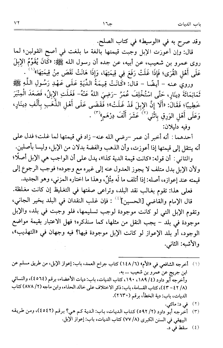 قال: وإن أعوزت الإبل وجبت قيمتها بالغة ما بلغت في أصح القولين؛ لما روى عمرو بن شعيب، عن أبيه، عن جده أن رسول الله صلى الله عليه وسلم: "كَانَ يُقَوِّمُ الإِبِلَ عَلَى أَهْلِ القُرَى؛ فَإِذَا غَلَتْ رَفَعَ فِي قِيمَتِهَا، وَإِذَا هَانَتْ نَقَصَ مِنْ قِيمَتِهَا".