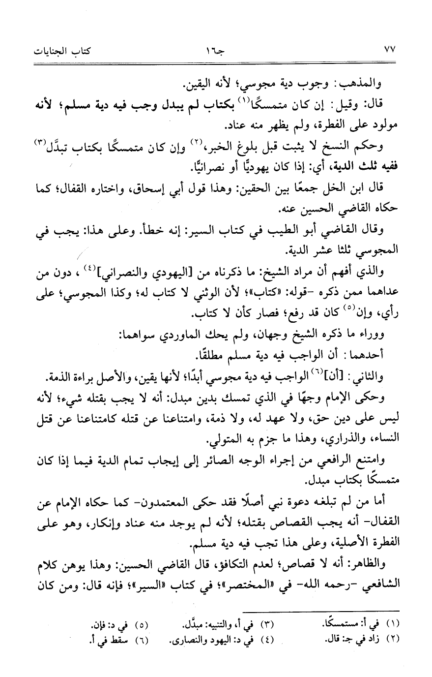 وحكم النسخ لا يثبت قبل بلوغ الخبر، وإن كان متمسكاً بكتاب تبدَّل ففيه ثلث الدية، أي: إذا كان يهوديًّا أو نصرانيًّا.
