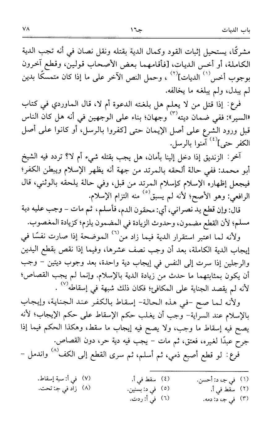 ولأنه لما صح- في هذه الحالة – إسقاط بالكفر عند الجناية، وإيجاب بالإسلام عند السراية – وجب أن يغلب حكم الإسقاط على حكم الإيجاب؛ لأنه يصح فيه إسقاط ما وجب، ولا يصح فيه إيجاب ما سقط، وهكذا الحكم فيما إذا جرح عبداً لغيره، فعتق، ثم مات – يجب فيه دية حر، دون القصاص.