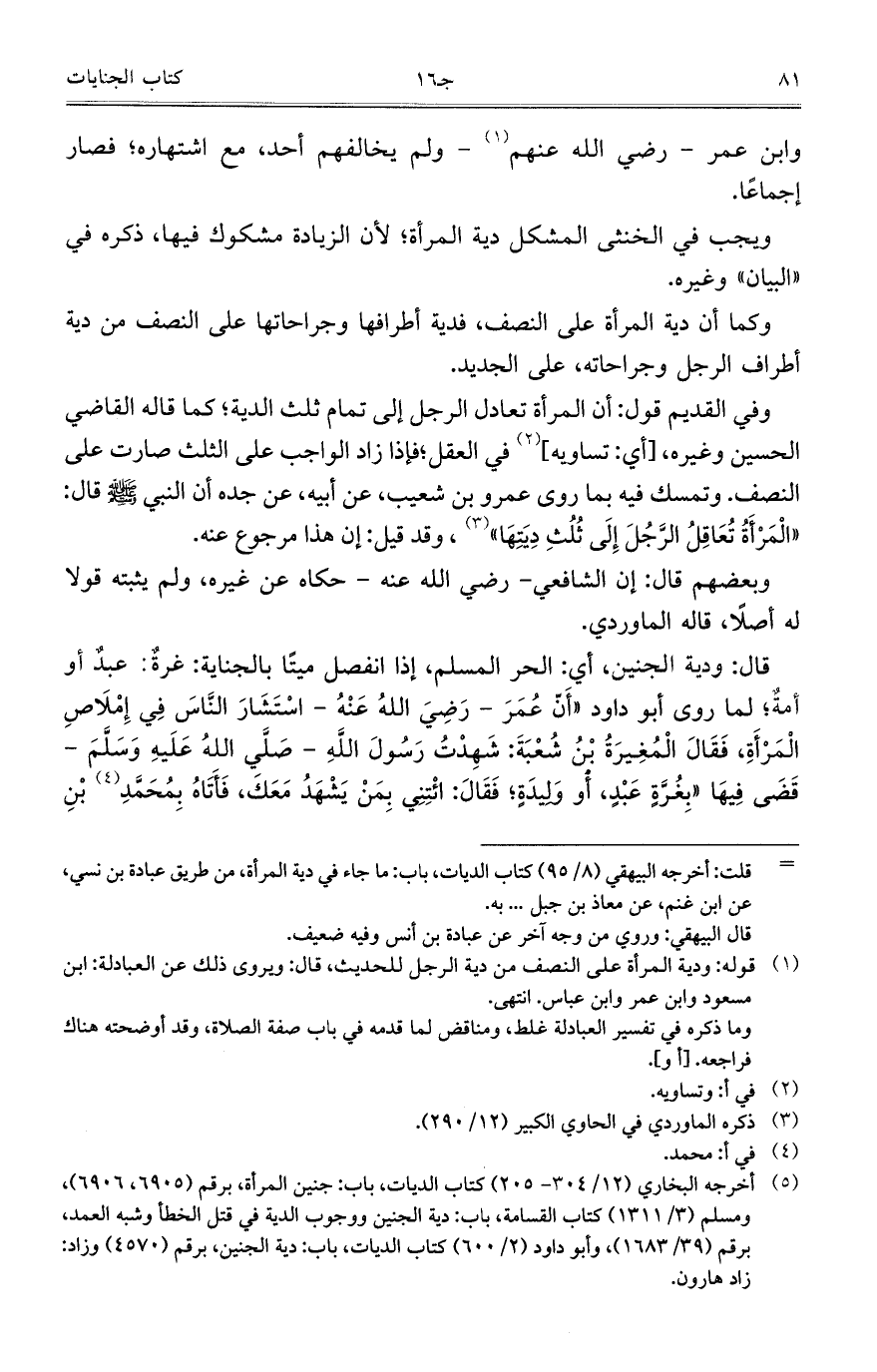 وفي القديم قول: أن المرأة تغادل الرجل إلى تمام ثلث الدية؛ كما قاله القاضي الحسين وغيره، [أي: تساويه] في العقل؛ فإذا زاد الواجب على الثلث صارت على النصف. وتمسك فيه بما روى عمرو بن شعيب، عن أبيه، عن جده أن النبي صلى الله عليه وسلم قال: "الْمَرْأَةُ تُعَاقِلُ الرَّجُلَ إِلَى ثُلُثِ دِيَتِهَا"، وقد قيل: إن هذا مرجوع عنه.