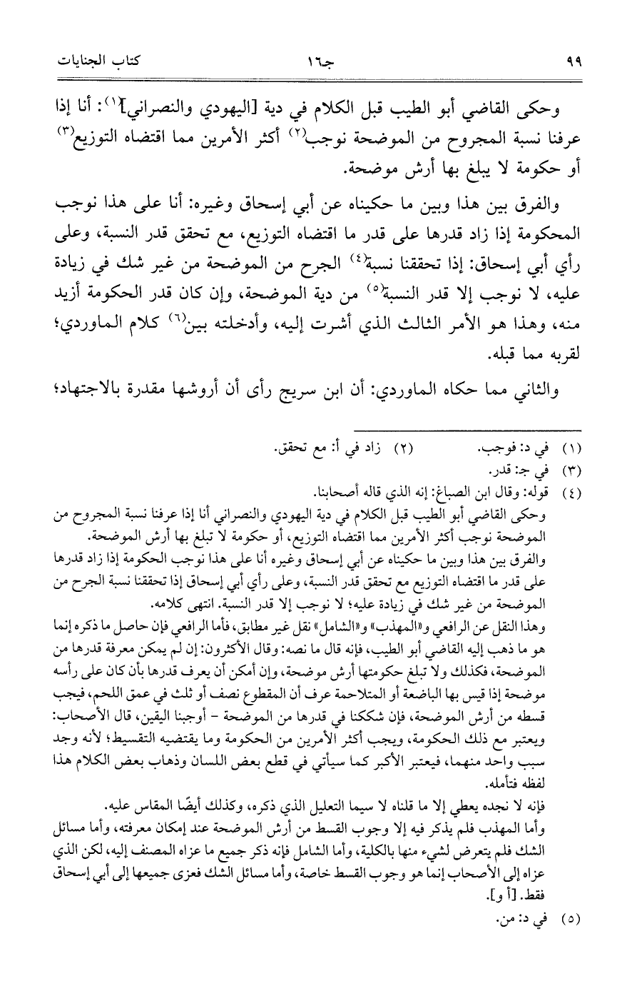 وحكى القاضي أبو الطيب قبل الكلام في دية [اليهودي والنصراني]: أنا إذا عرفنا نسبة المجروح من الموضحة نوجب أكثر الأمرين مما اقتضاه التوزيع أو حكومة لا يبلغ بها أرش موضحة.