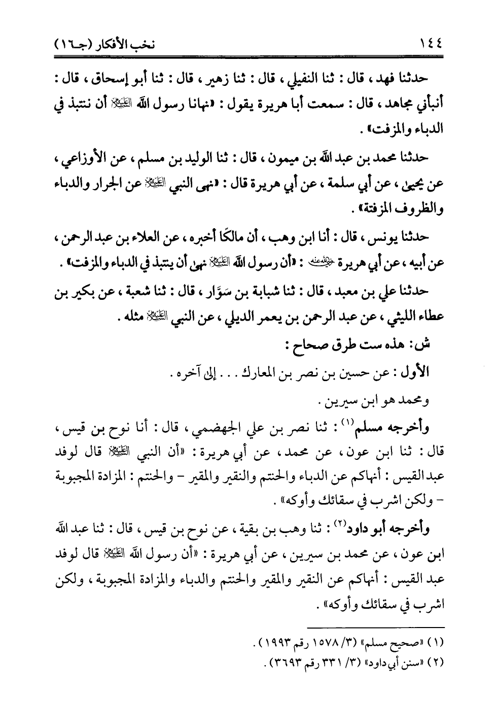وأخرجه مسلم (¬1): ثنا نصر بن علي الجهضمي، قال: أنا نوح بن قيس، قال: ثنا ابن عون، عن محمد، عن أبي هريرة: "أن النبي -عليه السلام- قال لوفد عبد القيس: أنهاكم عن الدباء والحنتم والنقير والمقير -والحنتم: المزادة المجبوبة- ولكن اشرب في سقائك وأوكه".