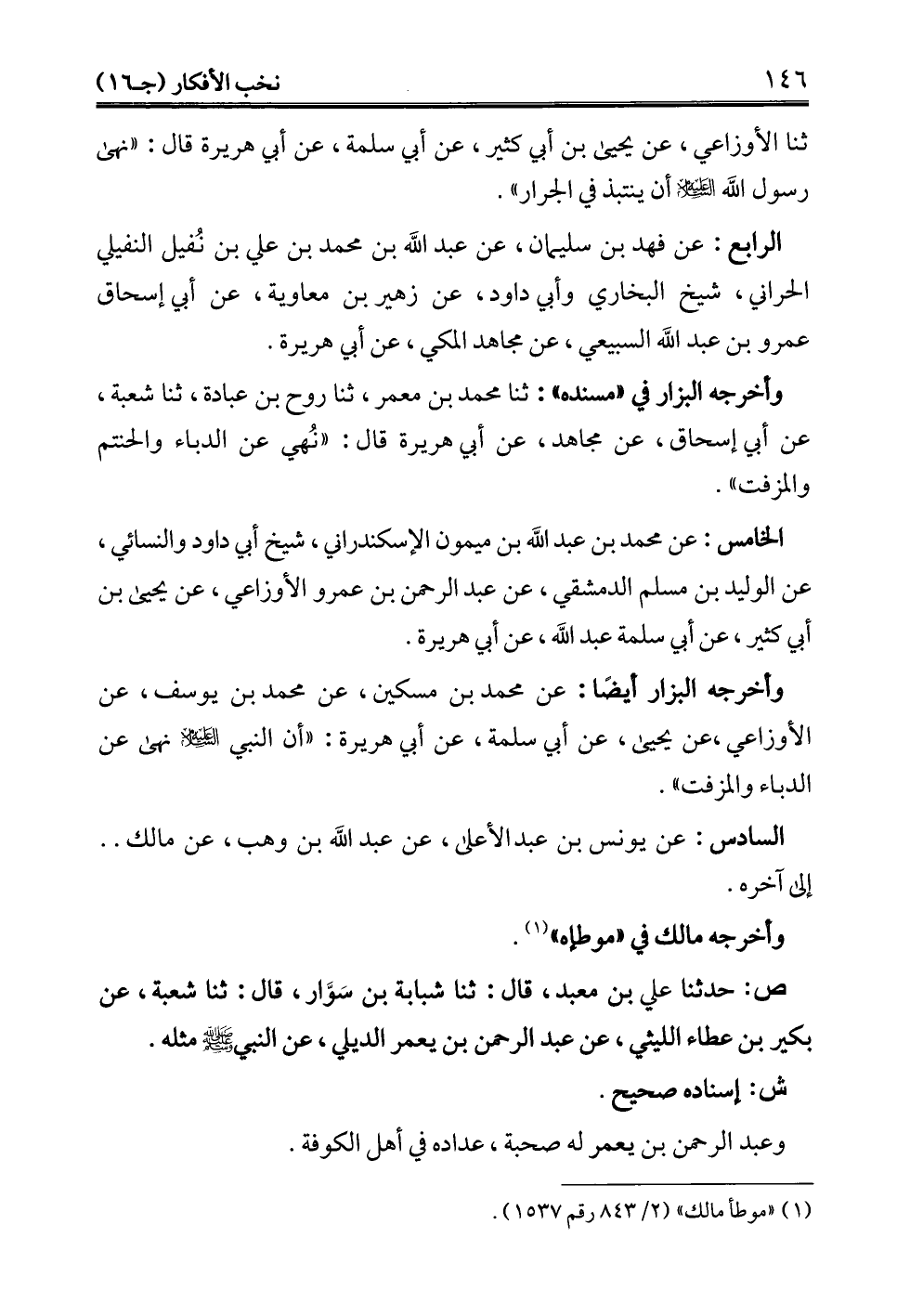 ثنا الأوزاعي، عن يحيى بن أبي كثير، عن أبي سلمة، عن أبي هريرة قال: "نهى رسول الله -عليه السلام- أن ينتبذ في الجرار".