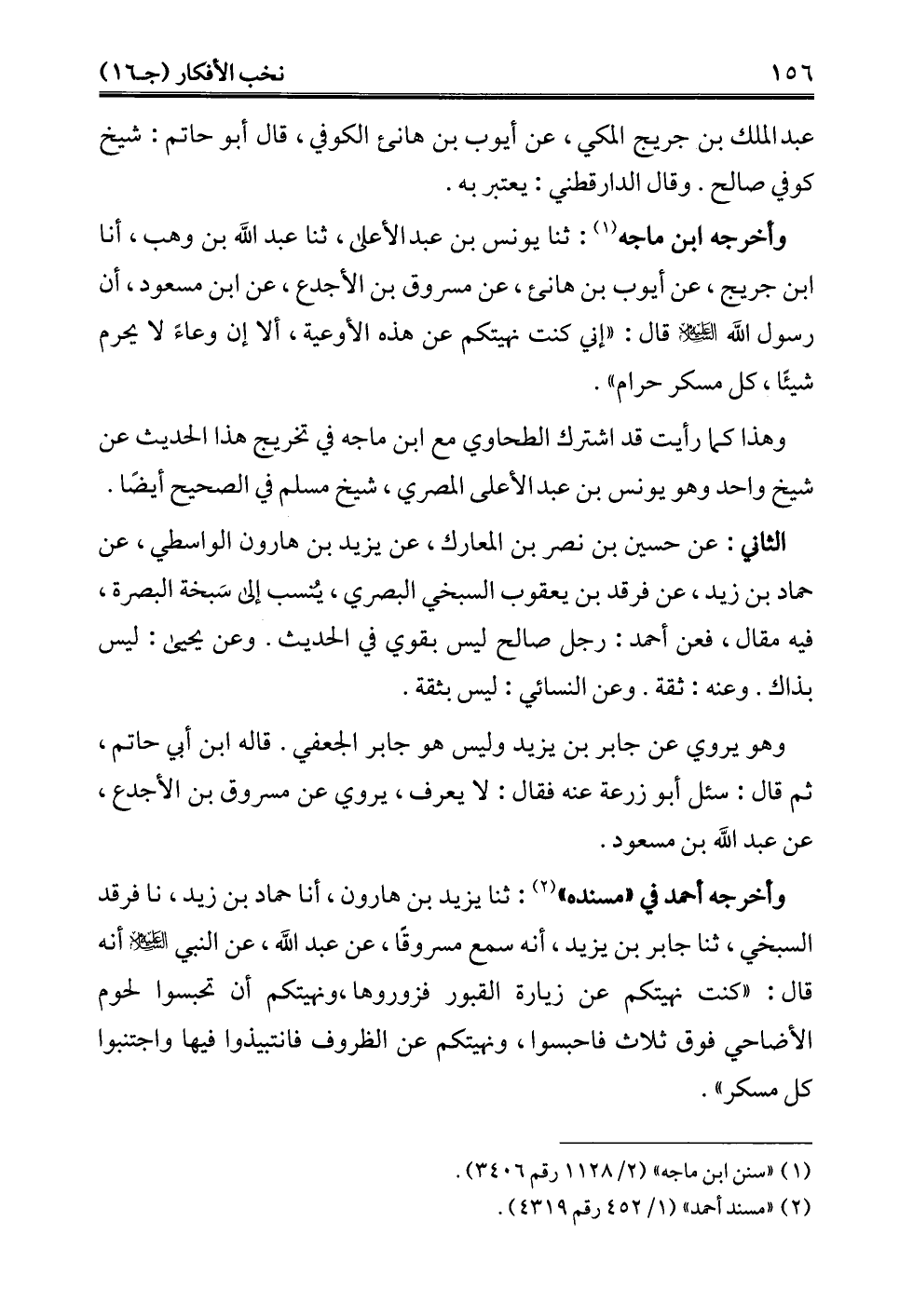 وأخرجه أحمد في "مسنده" (¬2): ثنا يزيد بن هارون، أنا حماد بن زيد، نا فرقد السبخي، ثنا جابر بن يزيد، أنه سمع مسروقًا، عن عبد الله، عن النبي -عليه السلام- أنه قال: "كنت نهيتكم عن زيارة القبور فزوروها، ونهيتكم أن تحبسوا لحوم الأضاحي فوق ثلاث فاحبسوا، ونهيتكم عن الظروف فانتبيذوا فيها واجتنبوا كل مسكر".
