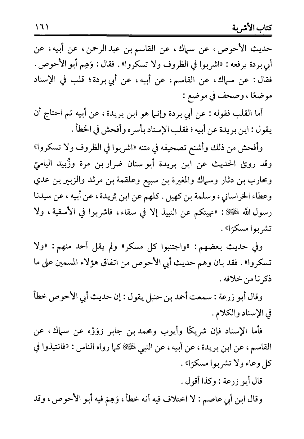حديث الأحوص، عن سماك، عن القاسم بن عبد الرحمن، عن أبيه، عن أبي بردة يرفعه: "اشربوا في الظروف ولا تسكروا". فقال: وَهِم أبو الأحوص. فقال: عن سماك، عن القاسم، عن أبيه، عن أبي بردة؛ قلب في الإسناد موضعًا، وصحف في موضع: