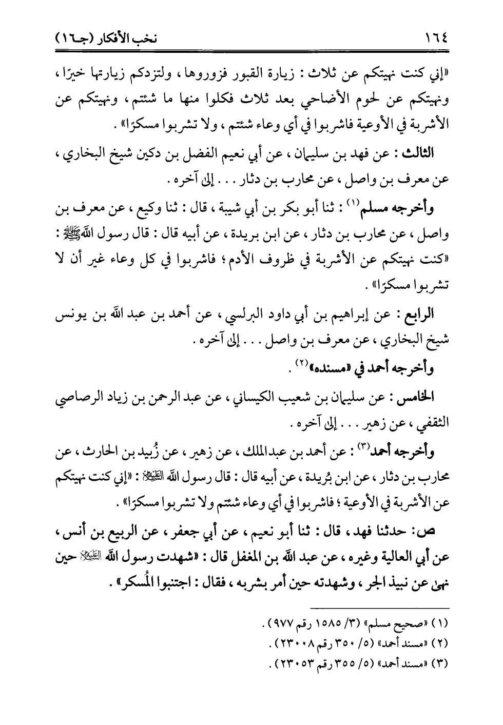 "إني كنت نهيتكم عن ثلاث: زيارة القبور فزوروها، ولتزدكم زيارتها خيرًا، ونهيتكم عن لحوم الأضاحي بعد ثلاث فكلوا منها ما شئتم، ونهيتكم عن الأشربة في الأوعية فاشربوا في أي وعاء شئتم، ولا تشربوا مسكرًا".
