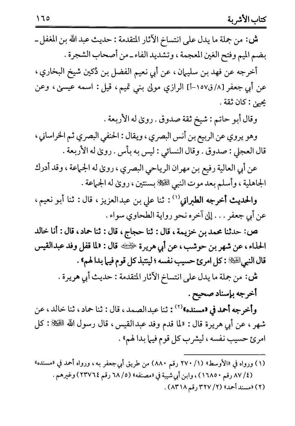 ش: من جملة ما يدل على انتساخ الآثار المتقدمة: حديث عبد الله بن المغفل -بضم الميم وفتح الغين المعجمة، وتشديد الفاء- من أصحاب الشجرة.
