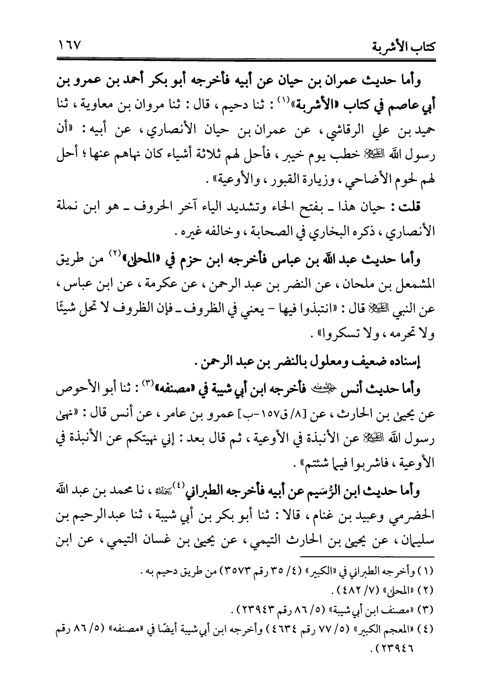 وأما حديث عمران بن حيان عن أبيه فأخرجه أبو بكر أحمد بن عمرو بن أبي عاصم في كتاب "الأشربة" (¬1): ثنا دحيم، قال: ثنا مروان بن معاوية، ثنا حميد بن علي الرقاشي، عن عمران بن حيان الأنصاري، عن أبيه: "أن رسول الله -عليه السلام- خطب يوم خيبر، فأحل لهم ثلاثة أشياء كان نهاهم عنها؛ أحل لهم لحوم الأضاحي، وزيارة القبور، والأوعية".