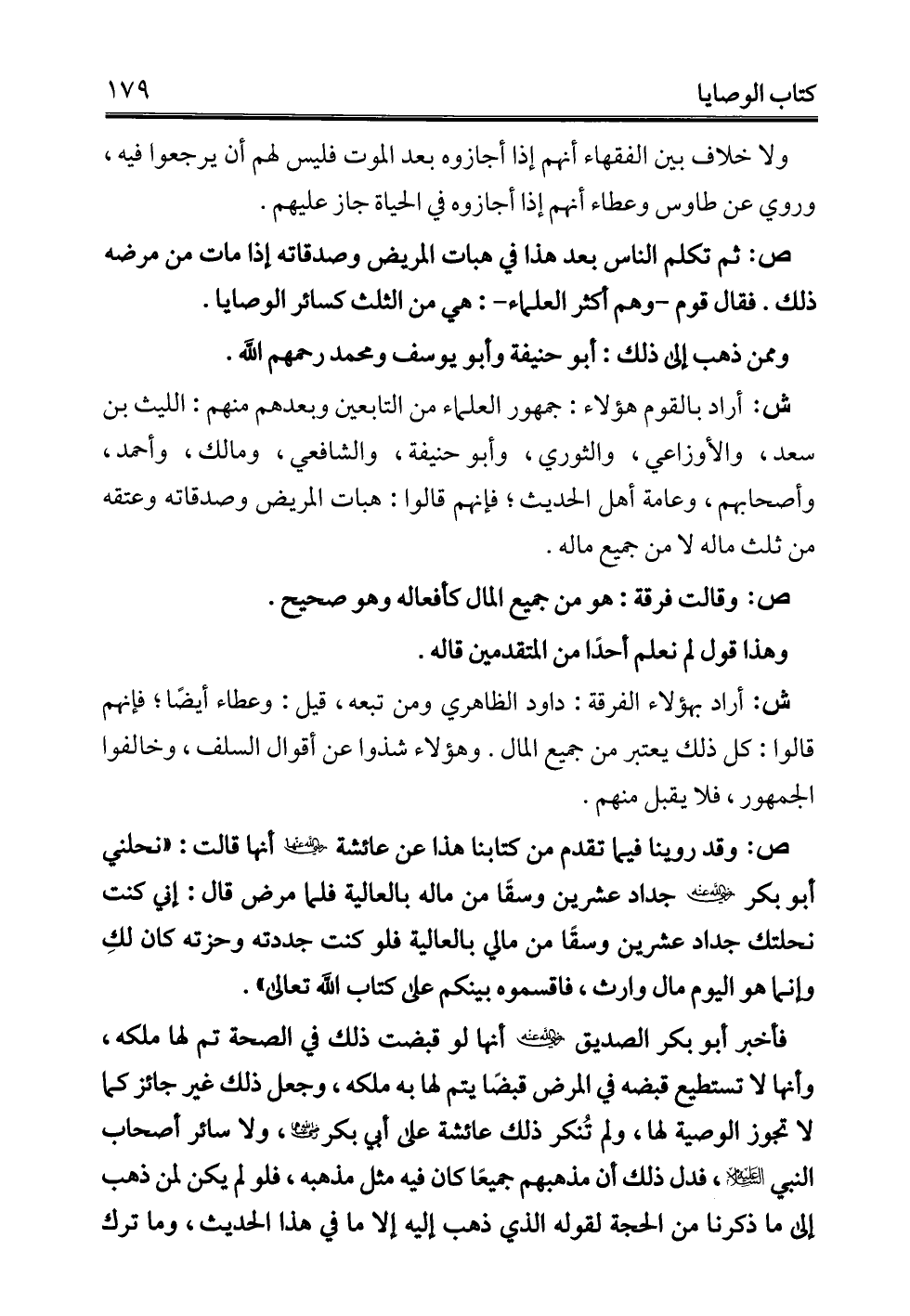ش: أراد بالقوم هؤلاء: جمهور العلماء من التابعين وبعدهم منهم: الليث بن سعد، والأوزاعي، والثوري، وأبو حنيفة، والشافعي، ومالك، وأحمد، وأصحابهم، وعامة أهل الحديث؛ فإنهم قالوا: هبات المريض وصدقاته وعتقه من ثلث ماله لا من جميع ماله.