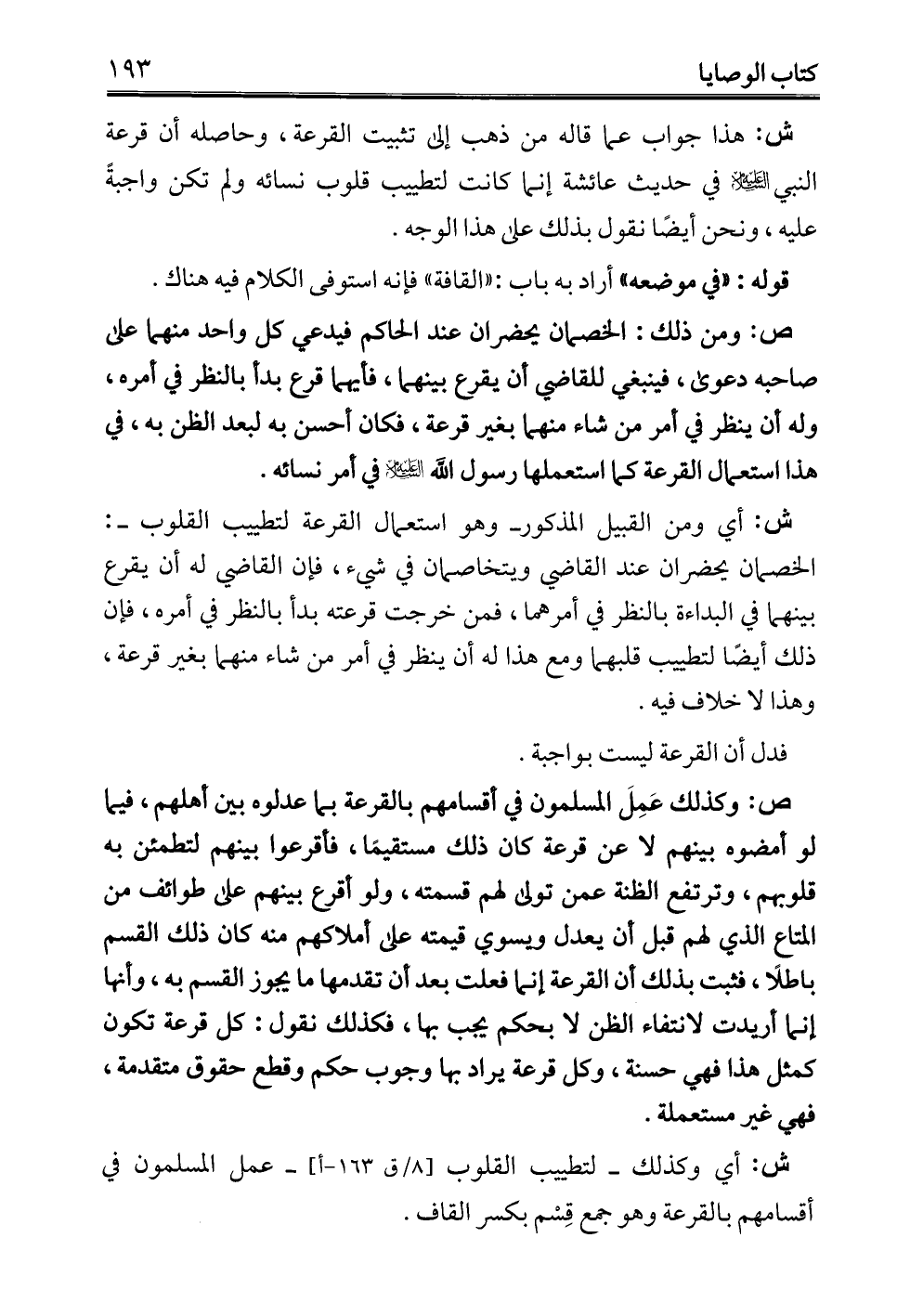 ش: أي وكذلك -لتطييب القلوب- عمل المسلمون في أقسامهم بالقرعة وهو جمع قِسْم بكسر القاف.