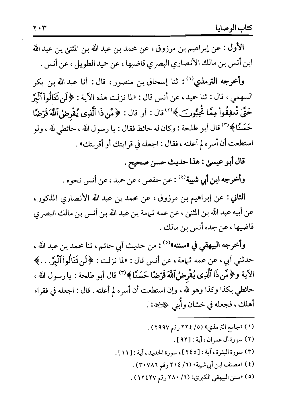وأخرجه البيهقي في "سننه" (¬5): من حديث أبي حاتم، ثنا محمد بن عبد الله، حدثني أبي، عن عمه ثمامة، عن أنس قال: "لما نزلت: {لَنْ تَنَالُوا الْبِرَّ. . . .} الآية و {مَنْ ذَا الَّذِي يُقْرِضُ اللَّهَ قَرْضًا حَسَنًا} (3) قال أبو طلحة: يا رسول الله، حائطي بكذا وكذا وهو لله، وإن استطعت أن أسره لم أعلنه. قال: اجعله في فقراء أهلك، فجعله في حَسَّان وأُبَي - رضي الله عنهما -".
