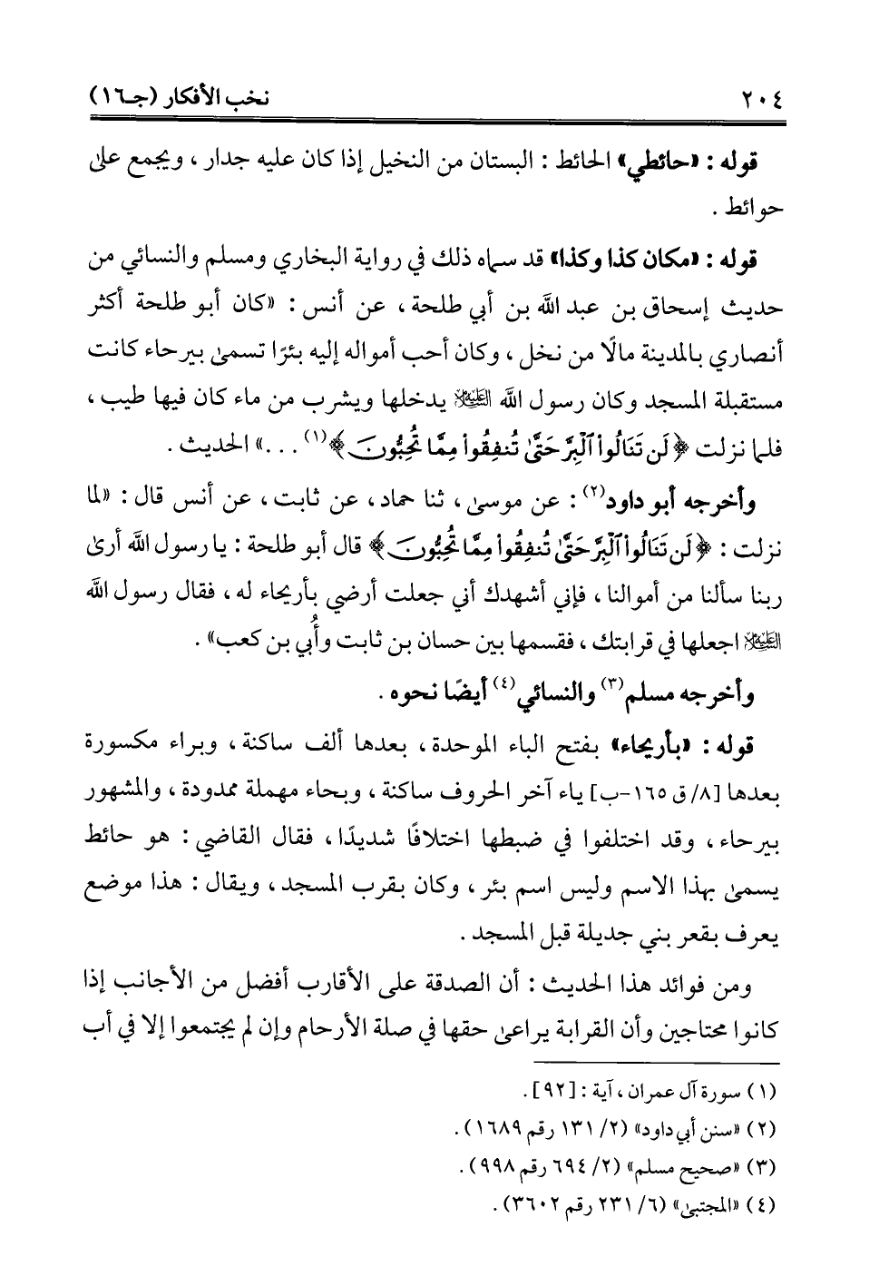 وأخرجه أبو داود (¬2): عن موسى، ثنا حماد، عن ثابت، عن أنس قال: "لما نزلت: {لَنْ تَنَالُوا الْبِرَّ حَتَّى تُنْفِقُوا مِمَّا تُحِبُّونَ} قال أبو طلحة: يا رسول الله أرى ربنا سألنا من أموالنا، فإني أشهدك أني جعلت أرضي بأريحاء له، فقال رسول الله -عليه السلام- اجعلها في قرابتك، فقسمها بين حسان بن ثابت وأُبي بن كعب".