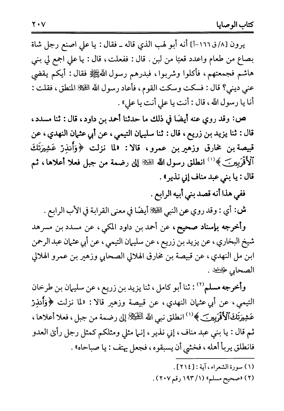 ص: وقد روي عنه أيضًا في ذلك ما حدثنا أحمد بن داود، قال: ثنا مسدد، قال: ثنا يزيد بن زريع، قال: ثنا سليمان التيمي، عن أبي عثمان النهدي، عن قبيصة بن مخارق وزهير بن عمرو، قالا: "لما نزلت {وَأَنْذِرْ عَشِيرَتَكَ الْأَقْرَبِينَ} (¬1) انطلق رسول الله -عليه السلام- إلى رضمة من جبل فعلا أعلاها، ثم قال: يا بني عبد مناف إني نذير".
