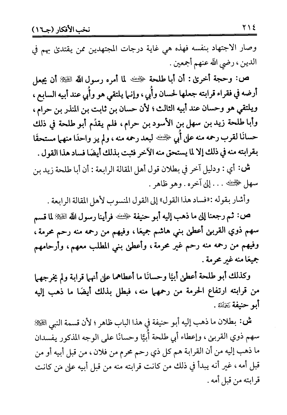 ش: أي: ودليل آخر في بطلان قول أهل المقالة الرابعة: أن أبا طلحة زيد بن سهل - رضي الله عنه -. . . . إلى آخره. وهو ظاهر.