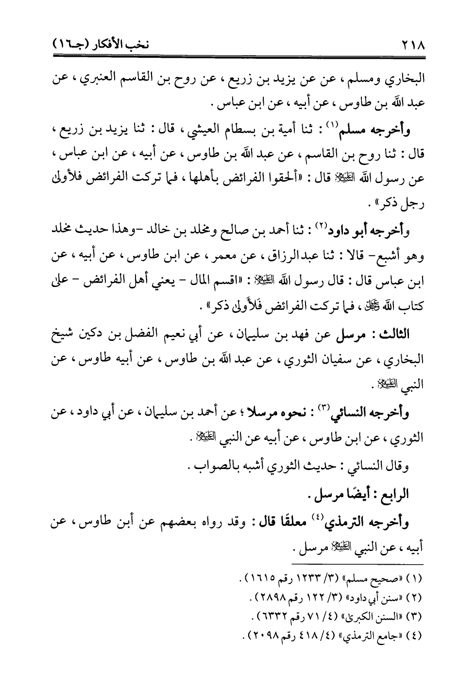 وأخرجه مسلم (¬1): ثنا أمية بن بسطام العيشي، قال: ثنا يزيد بن زريع، قال: ثنا روح بن القاسم، عن عبد الله بن طاوس، عن أبيه، عن ابن عباس، عن رسول الله -عليه السلام- قال: "ألحقوا الفرائض بأهلها، فما تركت الفرائض فلأولى رجل ذكر".