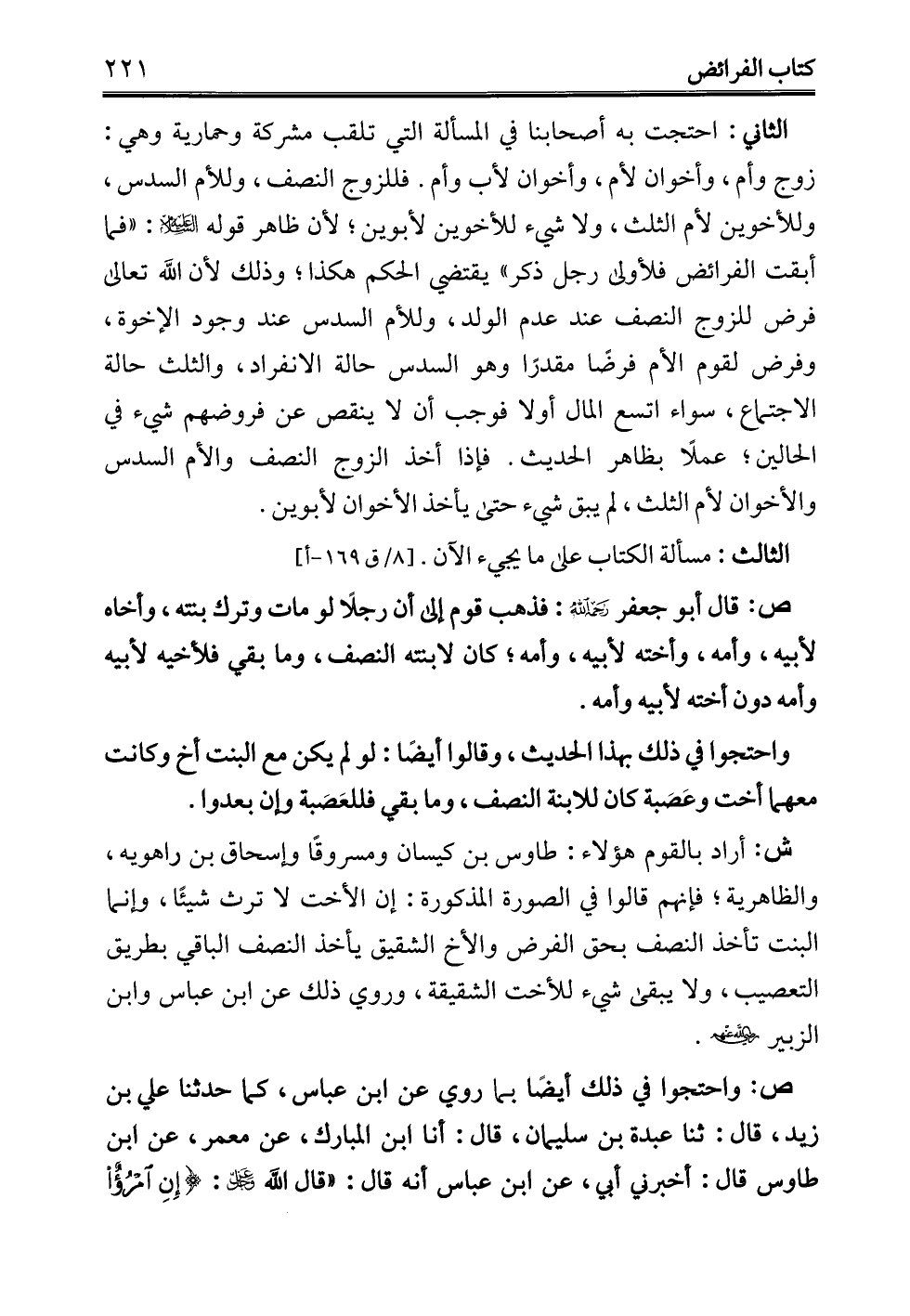 الثاني: احتجت به أصحابنا في المسألة التي تلقب مشركة وحمارية وهي: زوج وأم، وأخوان لأم، وأخوان لأب وأم. فللزوج النصف، وللأم السدس، وللأخوين لأم الثلث، ولا شيء للأخوين لأبوين؛ لأن ظاهر قوله -عليه السلام-: "فما أبقت الفرائض فلأولى رجل ذكر" يقتضي الحكم هكذا؛ وذلك لأن الله تعالى فرض للزوج النصف عند عدم الولد، وللأم السدس عند وجود الإخوة، وفرض لقوم الأم فرضًا مقدرًا وهو السدس حالة الانفراد، والثلث حالة الاجتماع، سواء اتسع المال أو لا فوجب أن لا ينقص عن فروضهم شيء في الحالين؛ عملًا بظاهر الحديث. فإذا أخذ الزوج النصف والأم السدس والأخوان لأم الثلث، لم يبق شيء حتى يأخذ الأخوان لأبوين.