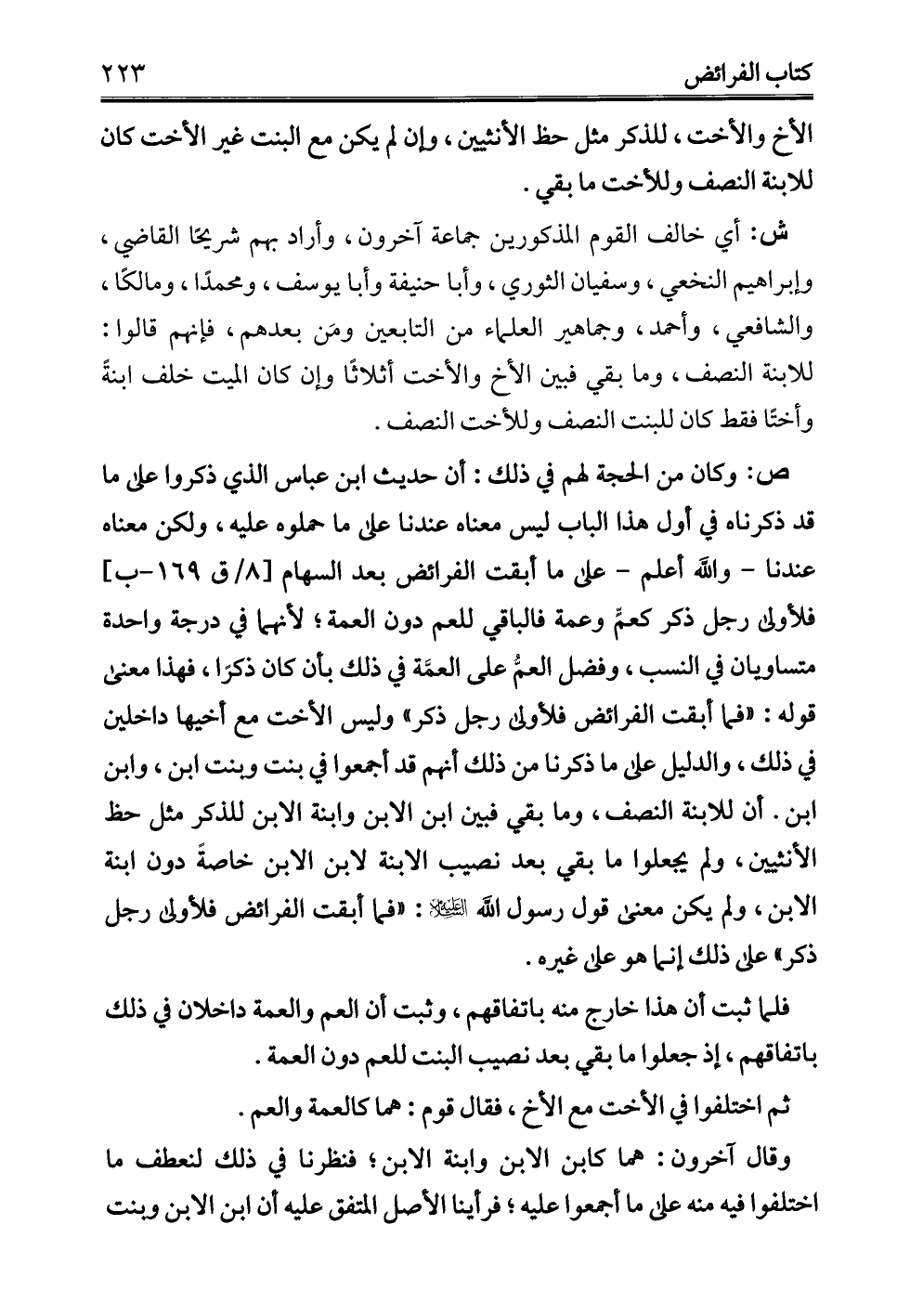 ش: أي خالف القوم المذكورين جماعة آخرون، وأراد بهم شريحًا القاضي، وإبراهيم النخعي، وسفيان الثوري، وأبا حنيفة وأبا يوسف، ومحمدًا، ومالكًا، والشافعي، وأحمد، وجماهير العلماء من التابعين ومَن بعدهم، فإنهم قالوا: للابنة النصف، وما بقي فبين الأخ والأخت أثلاثًا وإن كان الميت خلف ابنةً وأختًا فقط كان للبنت النصف وللأخت النصف.