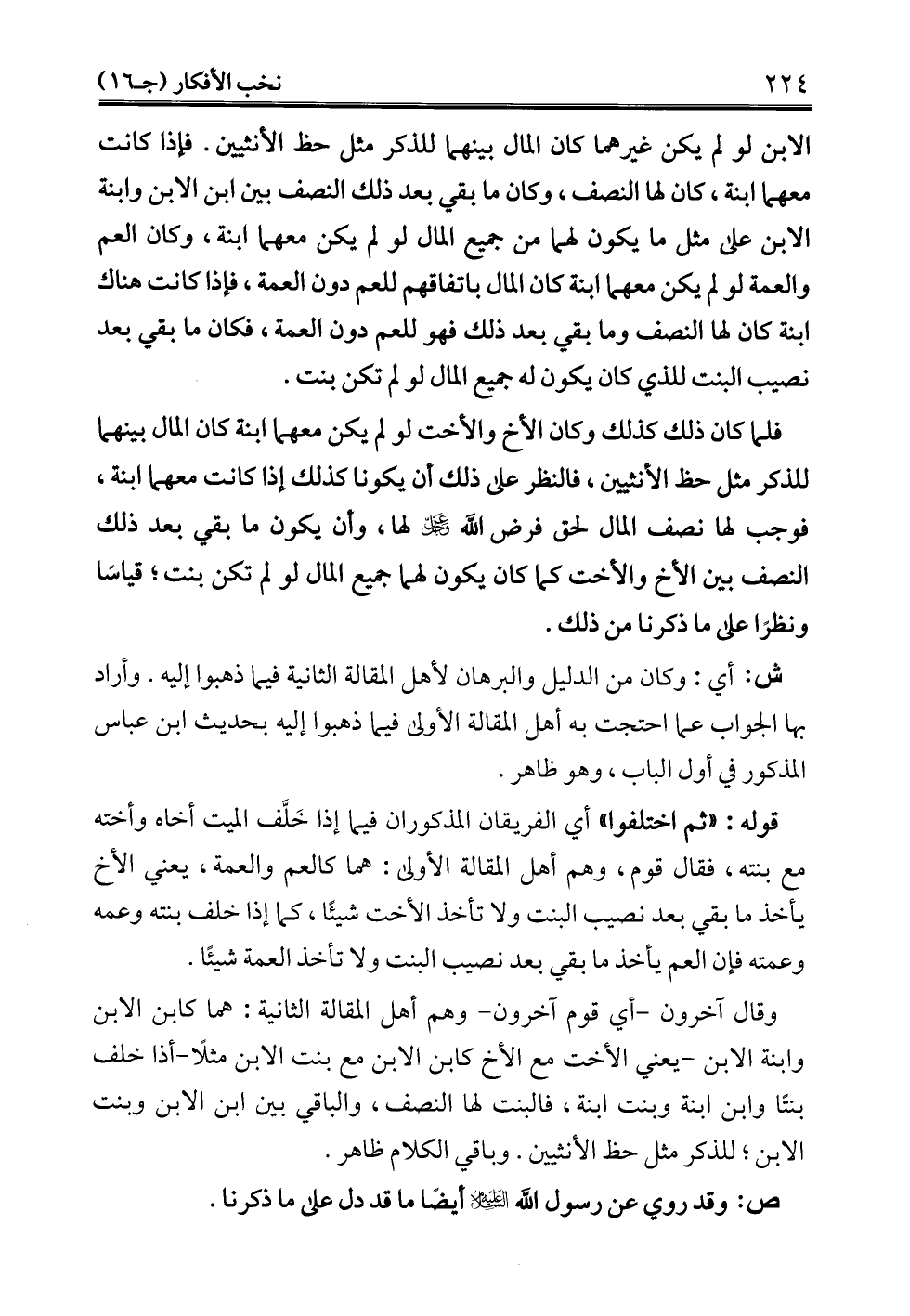 فلما كان ذلك كذلك وكان الأخ والأخت لو لم يكن معهما ابنة كان المال بينهما للذكر مثل حظ الأنثيين، فالنظر على ذلك أن يكونا كذلك إذا كانت معهما ابنة، فوجب لها نصف المال لحق فرض الله -عز وجل- لها، وأن يكون ما بقي بعد ذلك النصف بين الأخ والأخت كما كان يكون لهما جميع المال لو لم تكن بنت؛ قياسًا ونظرًا على ما ذكرنا من ذلك.
