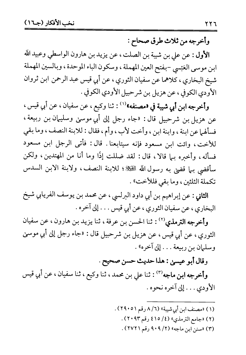 وأخرجه ابن أبي شيبة في "مصنفه" (¬1): ثنا وكيع، عن سفيان، عن أبي قيس، عن هزيل بن شرحبيل قال: "جاء رجل إلى أبي موسى وسليمان بن ربيعة، فسألهما عن ابنة، وابنة ابن، وأخت لأب، وأم، فقال: للابنة النصف، وما بقي للأخت، وائت ابن مسعود فإنه سيتابعنا. قال: فأتى الرجل ابن مسعود فسأله، وأخبره بما قالا، قال: لقد ضللت إذًا وما أنا من المهتدين، ولكن سأقضي بما قضى به رسول الله -عليه السلام-؛ للابنة النصف، ولابنة الابن السدس تكملة الثلثين، وما بقي فللأخت".