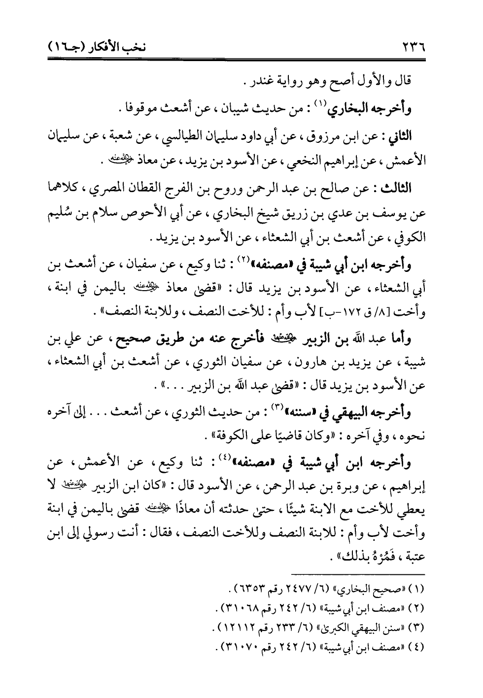 وأخرجه ابن أبي شيبة في "مصنفه" (¬4): ثنا وكيع، عن الأعمش، عن إبراهيم، عن وبرة بن عبد الرحمن، عن الأسود قال: "كان ابن الزبير - رضي الله عنهما - لا يعطي للأخت مع الابنة شيئًا، حتى حدثته أن معاذًا - رضي الله عنه - قضى باليمن في ابنة وأخت لأب وأم: للابنة النصف وللأخت النصف، فقال: أنت رسولي إلى ابن عتبة، فَمُرْهُ بذلك".