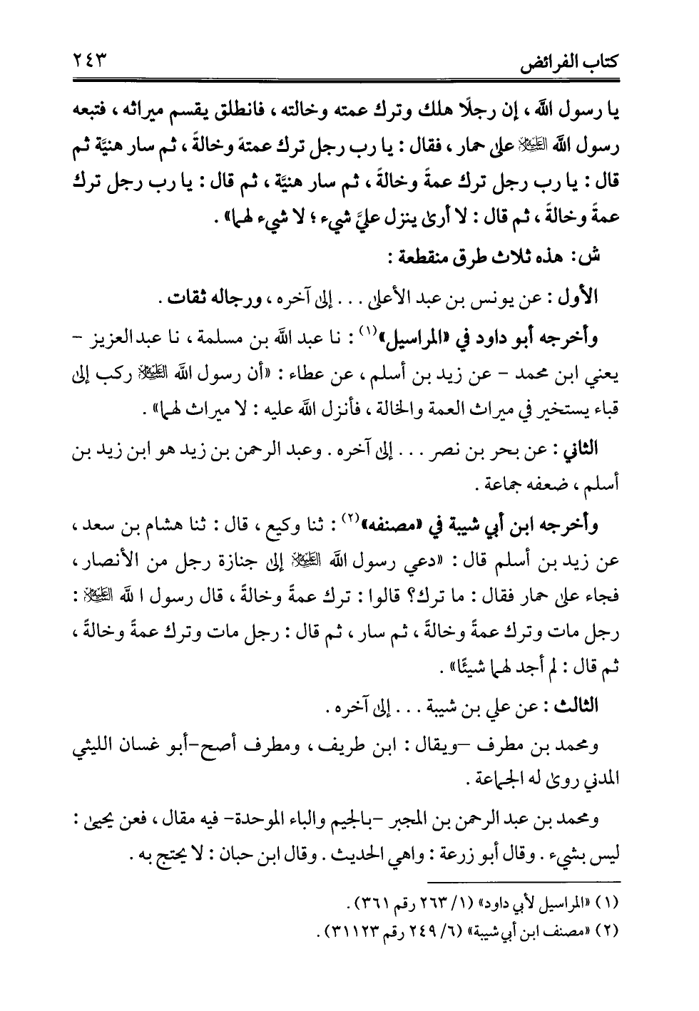 وأخرجه ابن أبي شيبة في "مصنفه" (¬2): ثنا وكيع، قال: ثنا هشام بن سعد، عن زيد بن أسلم قال: "دعي رسول الله -عليه السلام- إلى جنازة رجل من الأنصار، فجاء على حمار فقال: ما ترك؟ قالوا: ترك عمةً وخالةً، قال رسول الله -عليه السلام-: رجل مات وترك عمةً وخالةً، ثم سار، ثم قال: رجل مات وترك عمةً وخالةً، ثم قال: لم أجد لهما شيئًا".