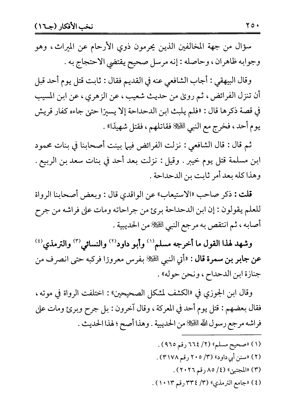 وقال البيهقي: أجاب الشافعي عنه في القديم فقال: ثابت قتل يوم أحد قبل أن تنزل الفرائض، ثم روى من حديث شعيب، عن الزهري، عن ابن المسيب في قصة ذكرها قال: "فلم يلبث ابن الدحداحة إلا يسيرًا حتى جاءه كفار قريش يوم أحد، فخرج مع النبي -عليه السلام- فقاتلهم، فقتل شهيدًا".