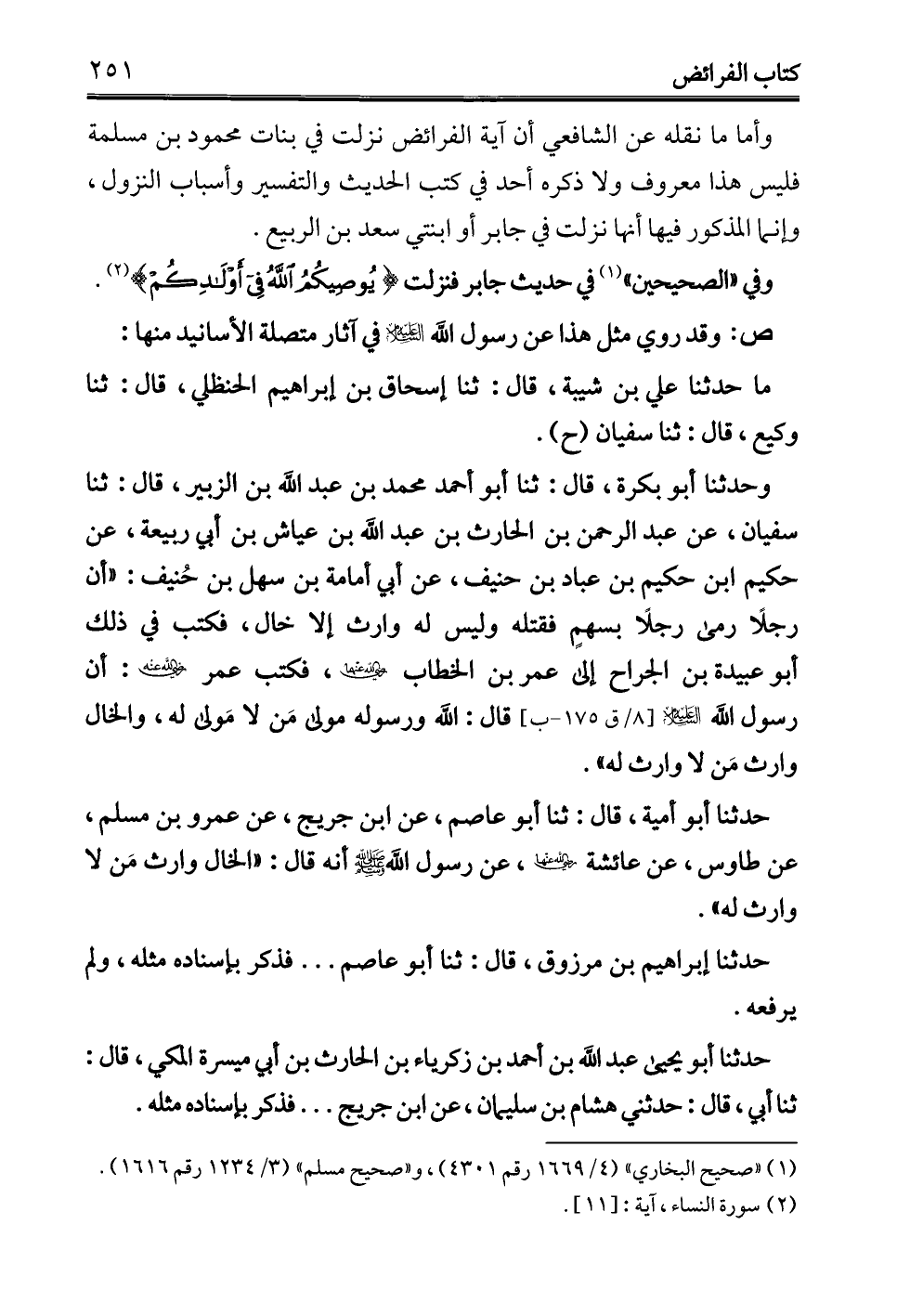 وحدثنا أبو بكرة، قال: ثنا أبو أحمد محمد بن عبد الله بن الزبير، قال: ثنا سفيان، عن عبد الرحمن بن الحارث بن عبد الله بن عياش بن أبي ربيعة، عن حكيم ابن حكيم بن عباد بن حنيف، عن أبي أمامة بن سهل بن حُنيف: "أن رجلًا رمى رجلًا بسهمٍ فقتله وليس له وارث إلا خال، فكتب في ذلك أبو عبيدة بن الجراح إلى عمر بن الخطاب - رضي الله عنهما -، فكتب عمر - رضي الله عنه -: أن رسول الله -عليه السلام- قال: الله ورسوله مولى مَن لا مَولى له، والخال وارث مَن لا وارث له".