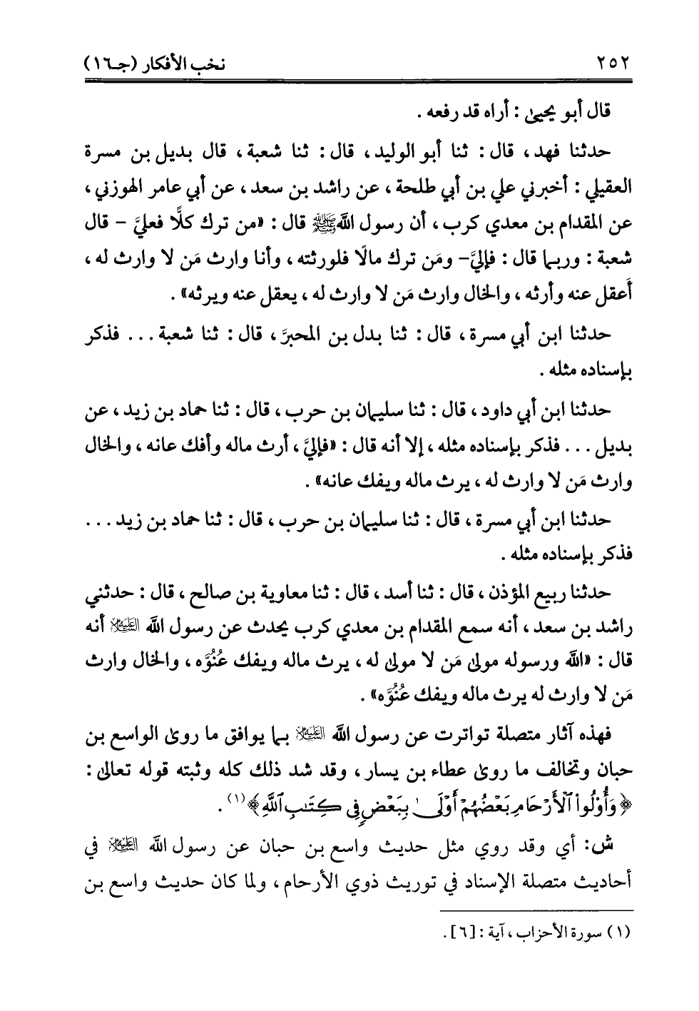 فهذه آثار متصلة تواترت عن رسول الله -عليه السلام- بما يوافق ما روى الواسع بن حبان وتخالف ما روى عطاء بن يسار، وقد شد ذلك كله وثبته قوله تعالى: {وَأُولُو الْأَرْحَامِ بَعْضُهُمْ أَوْلَى بِبَعْضٍ فِي كِتَابِ اللَّهِ} (¬1).