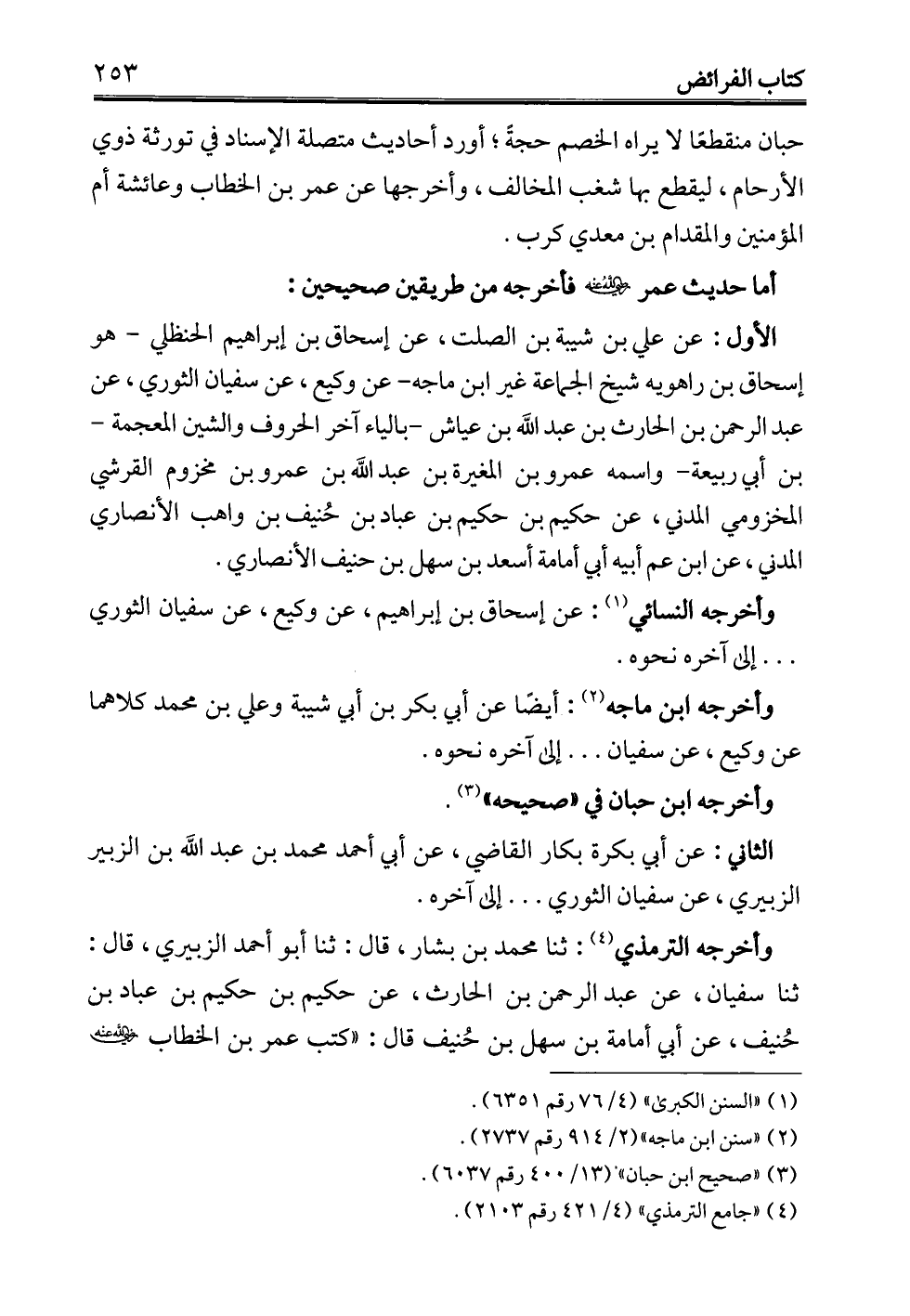 حبان منقطعًا لا يراه الخصم حجةً؛ أورد أحاديث متصلة الإسناد في تورثة ذوي الأرحام، ليقطع بها شغب المخالف، وأخرجها عن عمر بن الخطاب وعائشة أم المؤمنين والمقدام بن معدي كرب.
