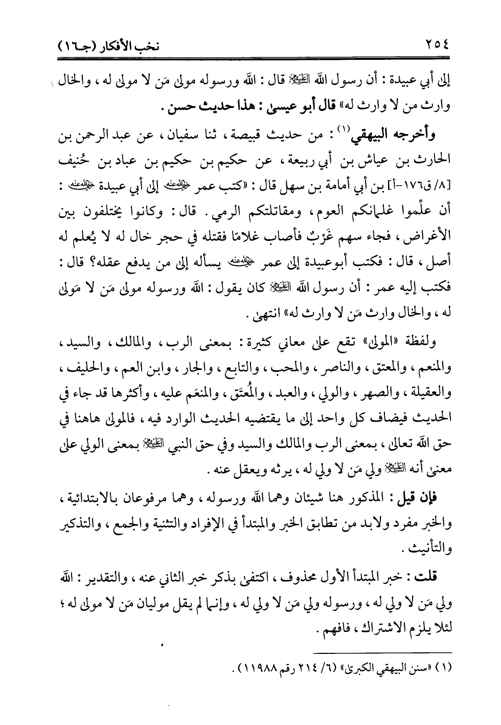 وأخرجه البيهقي (¬1): من حديث قبيصة، ثنا سفيان، عن عبد الرحمن بن الحارث بن عياش بن أبي ربيعة، عن حكيم بن حكيم بن عباد بن حُنيف بن أبي أمامة بن سهل قال: "كتب عمر - رضي الله عنه - إلى أبي عبيدة - رضي الله عنه -: أن علِّموا غلمانكم العوم، ومقاتلتكم الرمي. قال: وكانوا يختلفون بين الأغراض، فجاء سهم غَربٌ فأصاب غلامًا فقتله في حجر خال له لا يُعلم له أصل، قال: فكتب أبو عبيدة إلى عمر - رضي الله عنه - يسأله إلى من يدفع عقله؟ قال: فكتب إليه عمر: أن رسول الله -عليه السلام- كان يقول: الله ورسوله مولى مَن لا مَولى له، والخال وارث مَن لا وارث له" انتهى.
