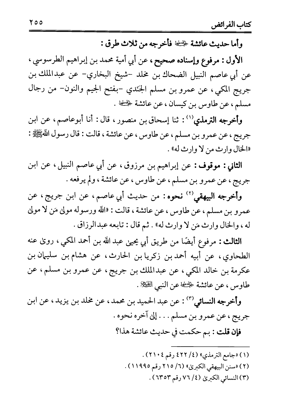 وأخرجه الترمذي (¬1): ثنا إسحاق بن منصور، قال: أنا أبو عاصم، عن ابن جريج، عن عمرو بن مسلم، عن طاوس، عن عائشة، قالت: قال رسول الله - صلى الله عليه وسلم -: "الخال وارث من لا وارث له".