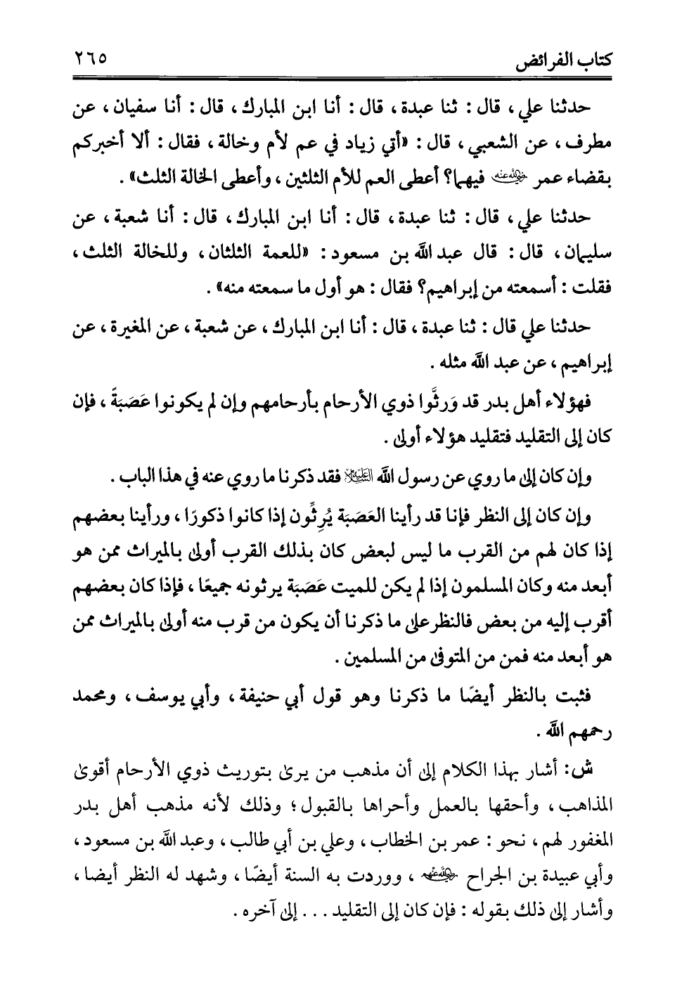 فهؤلاء أهل بدر قد وَرثَّوا ذوي الأرحام بأرحامهم وإن لم يكونوا عَصَبَة، فإن كان إلى التقليد فتقليد هؤلاء أولى.