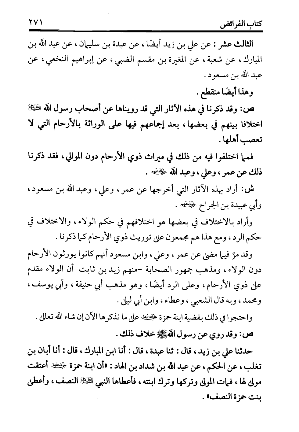 حدثنا علي بن زيد، قال: ثنا عبدة، قال: أنا ابن المبارك، قال: أنا أبان بن تغلب، عن الحكم، عن عبد الله بن شداد بن الهاد: "أن ابنة حمزة - رضي الله عنهما - أعتقت مولى لها، فمات المولى وتركها وترك ابنته، فأعطاها النبي -عليه السلام- النصف، وأعطى بنت حمزة النصف".