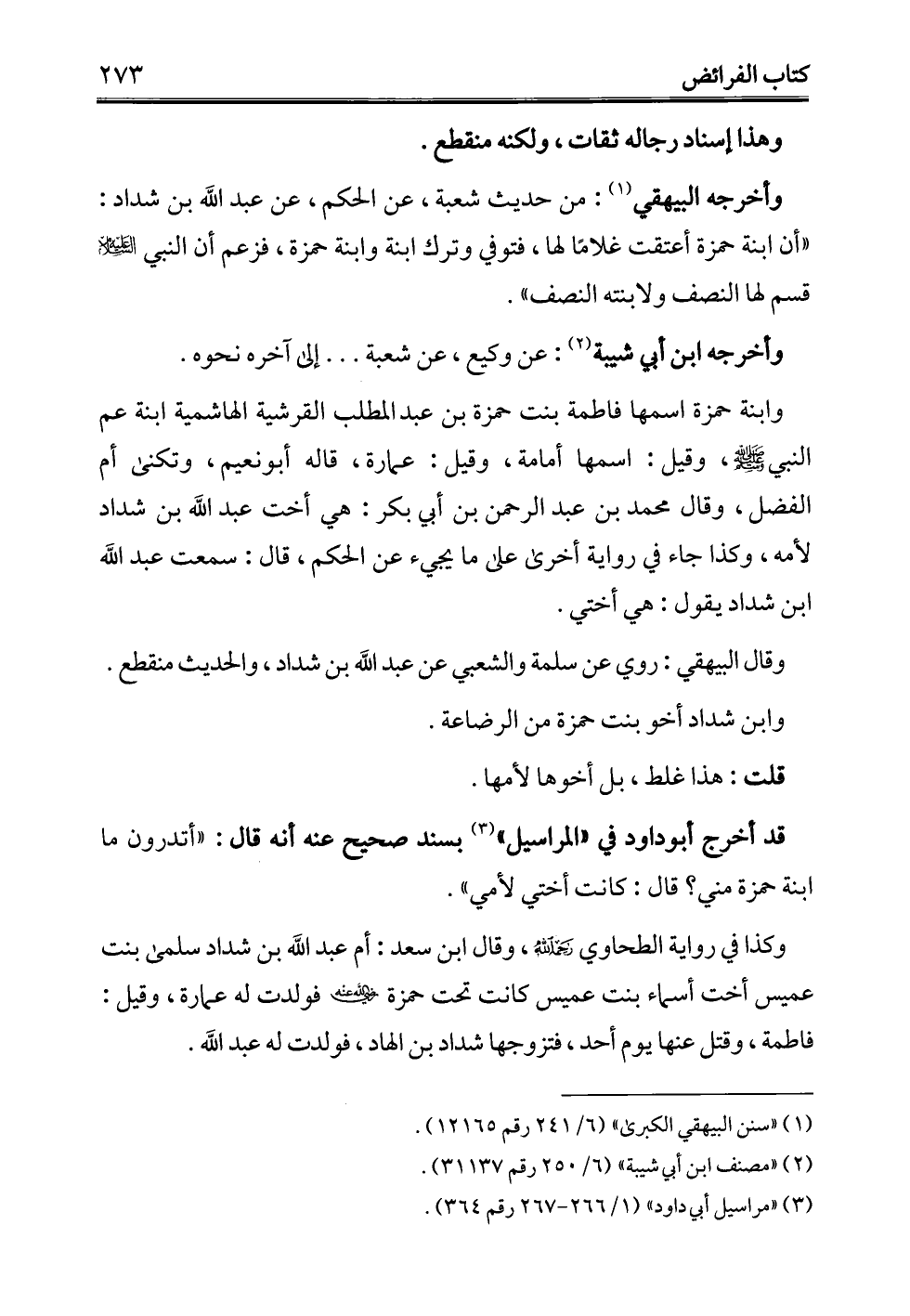 وأخرجه البيهقي (¬1): من حديث شعبة، عن الحكم، عن عبد الله بن شداد: "أن ابنة حمزة أعتقت غلامًا لها، فتوفي وترك ابنة وابنة حمزة، فزعم أن النبي -عليه السلام- قسم لها النصف ولابنته النصف".