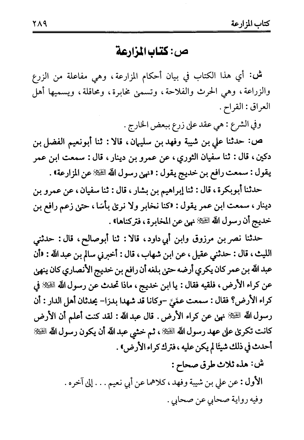 ش: أي هذا الكتاب في بيان أحكام المزارعة، وهي مفاعلة من الزرع والزراعة، وهي الحرث والفلاحة، وتسمى مخابرة، ومحاقلة، ويسميها أهل العراق: القراح.