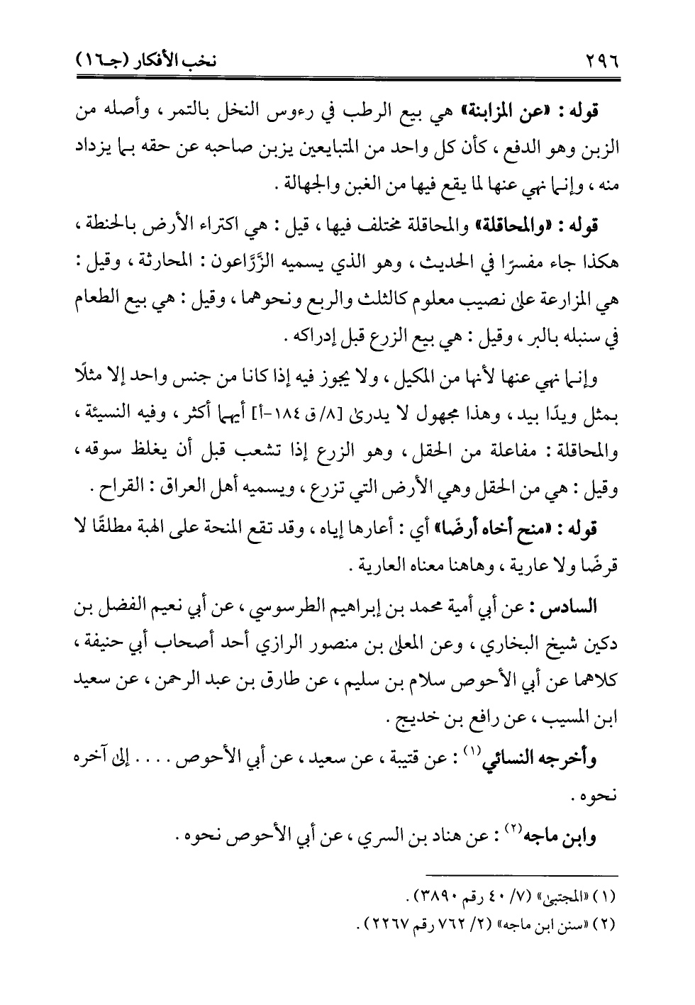 السادس: عن أبي أمية محمد بن إبراهيم الطرسوسي، عن أبي نعيم الفضل بن دكين شيخ البخاري، وعن المعلى بن منصور الرازي أحد أصحاب أبي حنيفة، كلاهما عن أبي الأحوص سلام بن سليم، عن طارق بن عبد الرحمن، عن سعيد بن المسيب، عن رافع بن خديج.