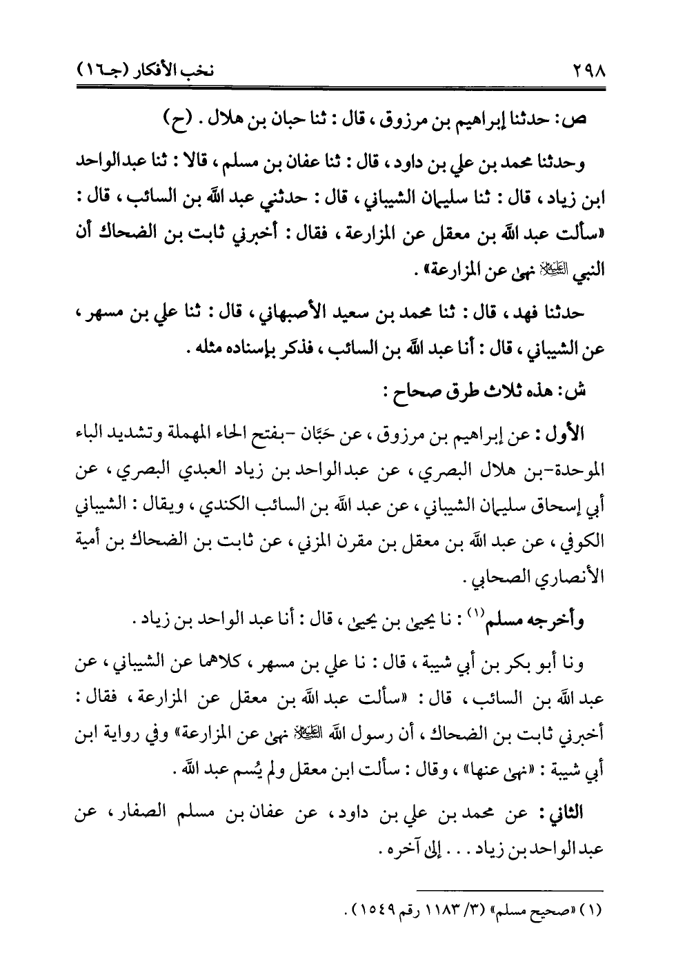ونا أبو بكر بن أبي شيبة، قال: نا علي بن مسهر، كلاهما عن الشيباني، عن عبد الله بن السائب، قال: "سألت عبد الله بن معقل عن المزارعة، فقال: أخبرني ثابت بن الضحاك، أن رسول الله -عليه السلام- نهى عن المزارعة" وفي رواية ابن أبي شيبة: "نهى عنها"، وقال: سألت ابن معقل ولم يُسم عبد الله.