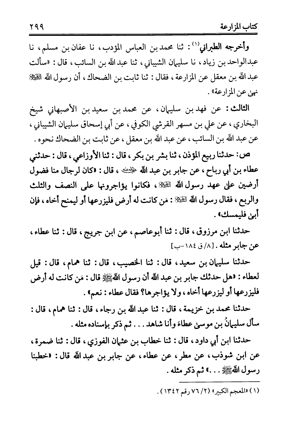 وأخرجه الطبراني (¬1): ثنا محمد بن العباس المؤدب، نا عفان بن مسلم، نا عبد الواحد بن زياد، نا سليمان الشيباني، ثنا عبد الله بن السائب، قال: "سألت عبد الله بن معقل عن المزارعة، فقال: ثنا ثابت بن الضحاك، أن رسول الله -عليه السلام- نهى عن المزارعة".